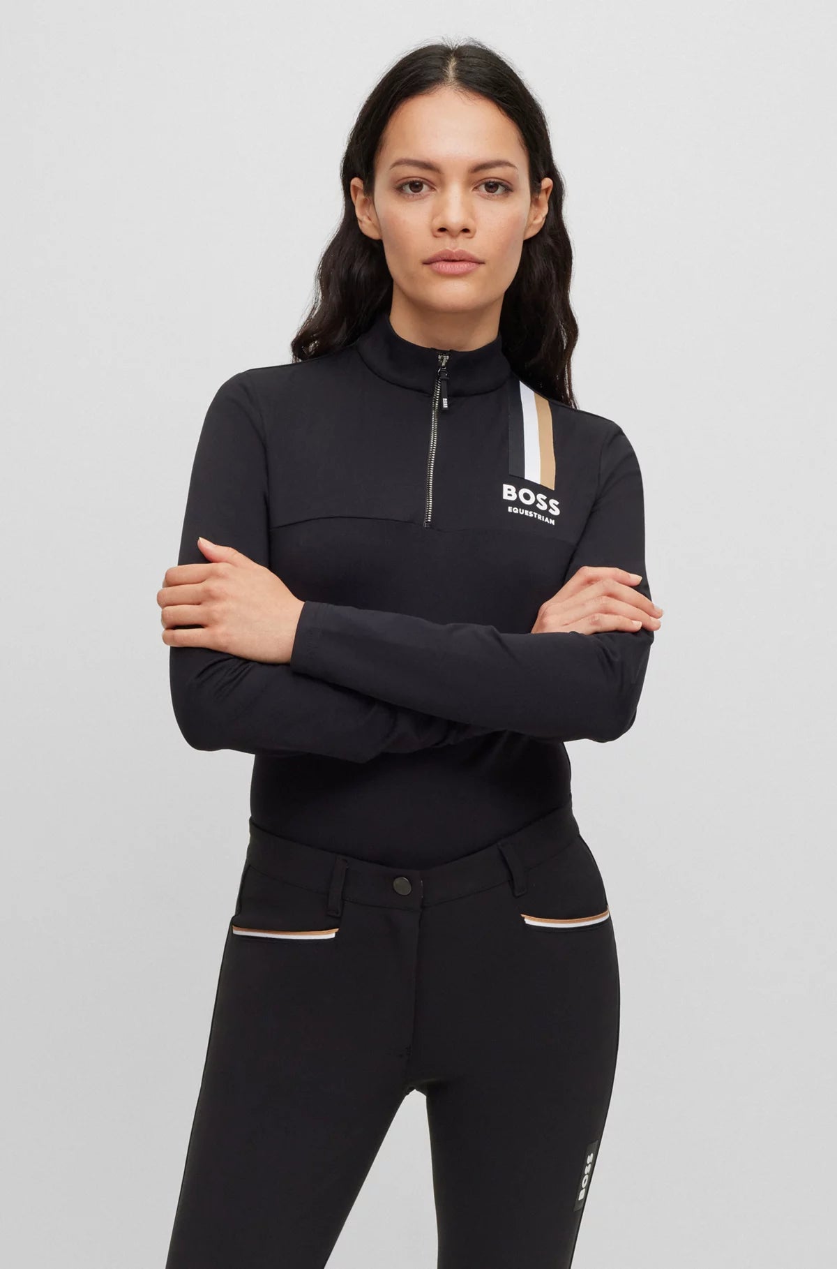 The Cavalleria Toscana Women’s Long Sleeve Training Polo with Half-Zip is crafted from technical wool and designed to support female riders during sports activities on cooler days. The design features water-repellent, windproof technical fabric on the sleeves and shoulders, while the wool body ensures thermal comfort and breathability. The high collar and personalized half-zip improve protection and fit. Finished with the Cavalleria Toscana heat-applied logo, this polo blends performance, contemporary design, and functional style.