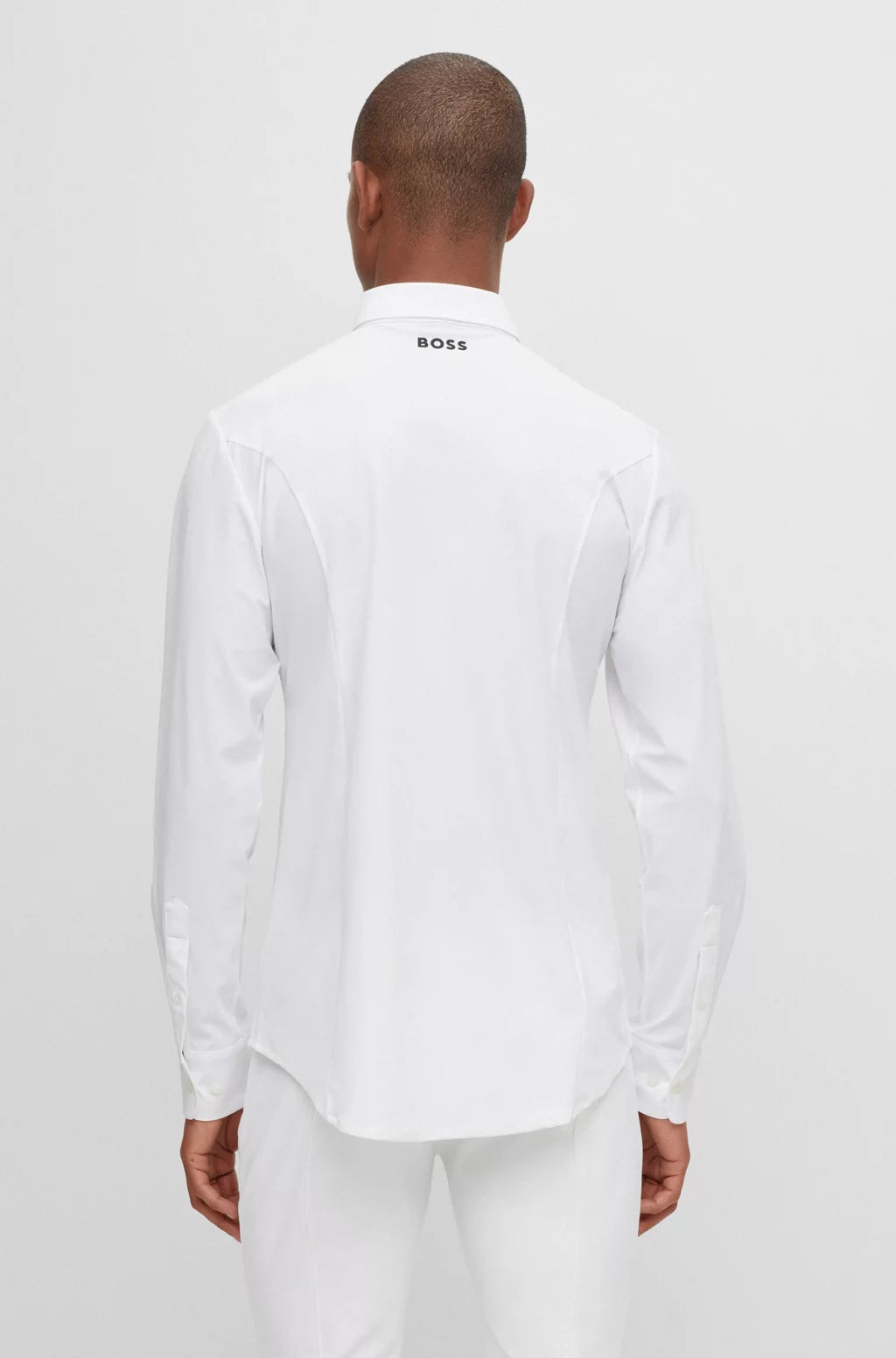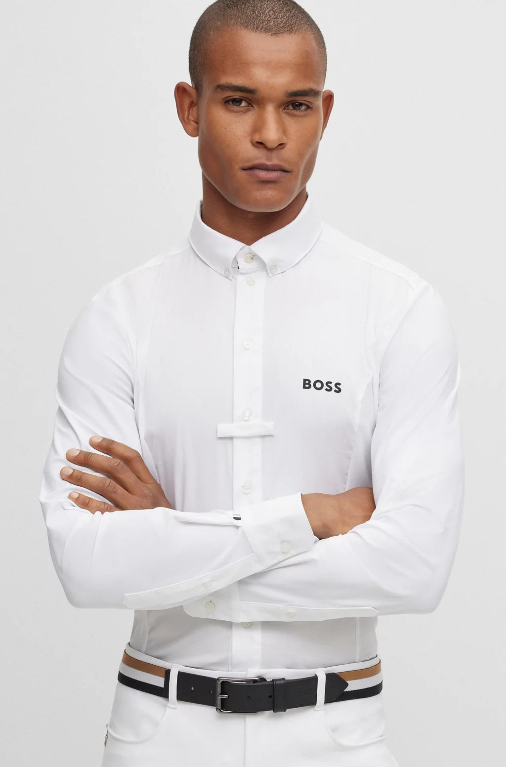 A hybrid show shirt developed for optimum comfort by BOSS Menswear. Cut to a slim fit with a button-down collar, this long-sleeved shirt comprises cotton-blend material with power-stretch fabric at the side panels for total freedom of movement. A detachable tie bar and a contrast BOSS logo add the finishing touches.