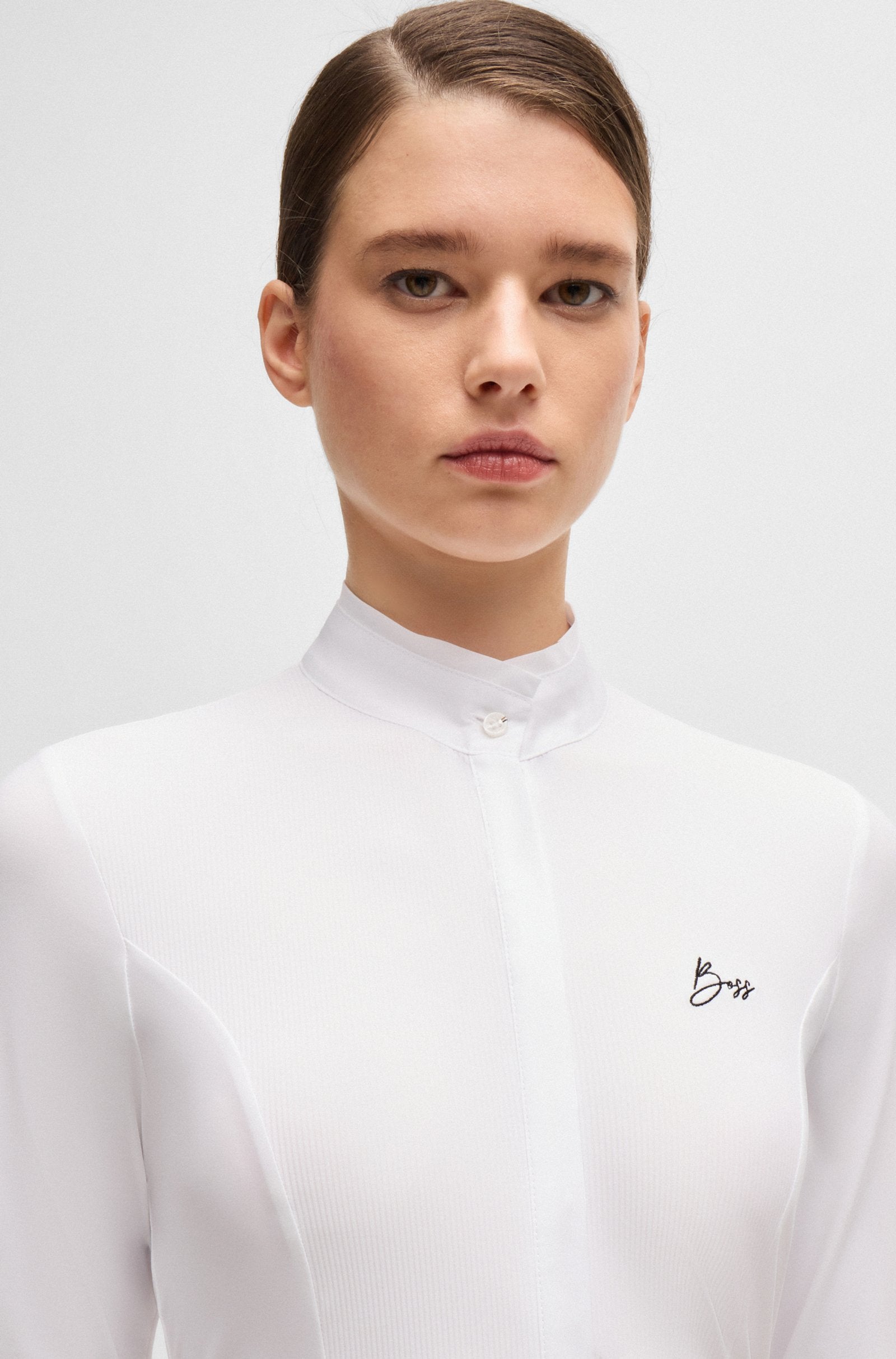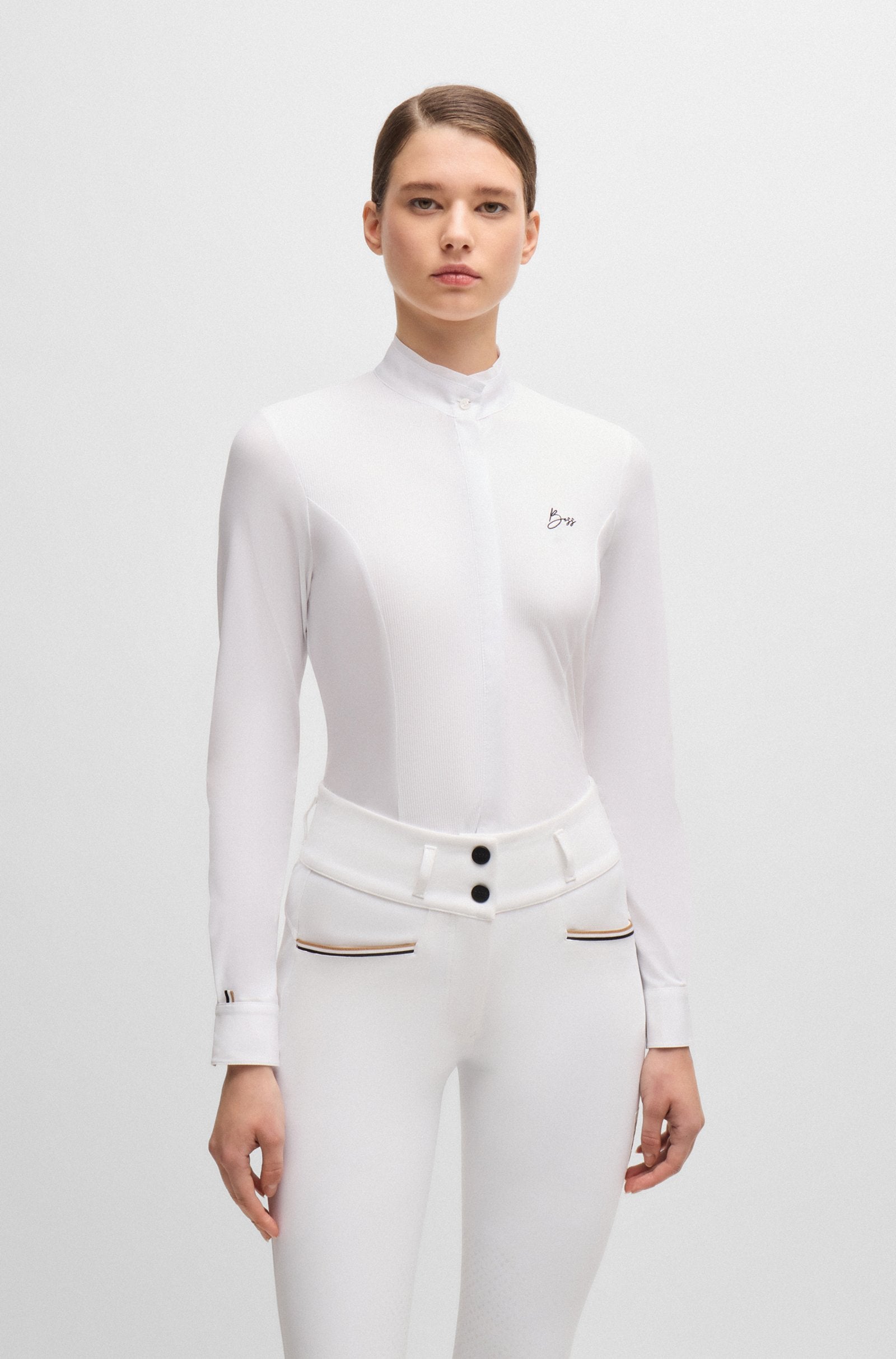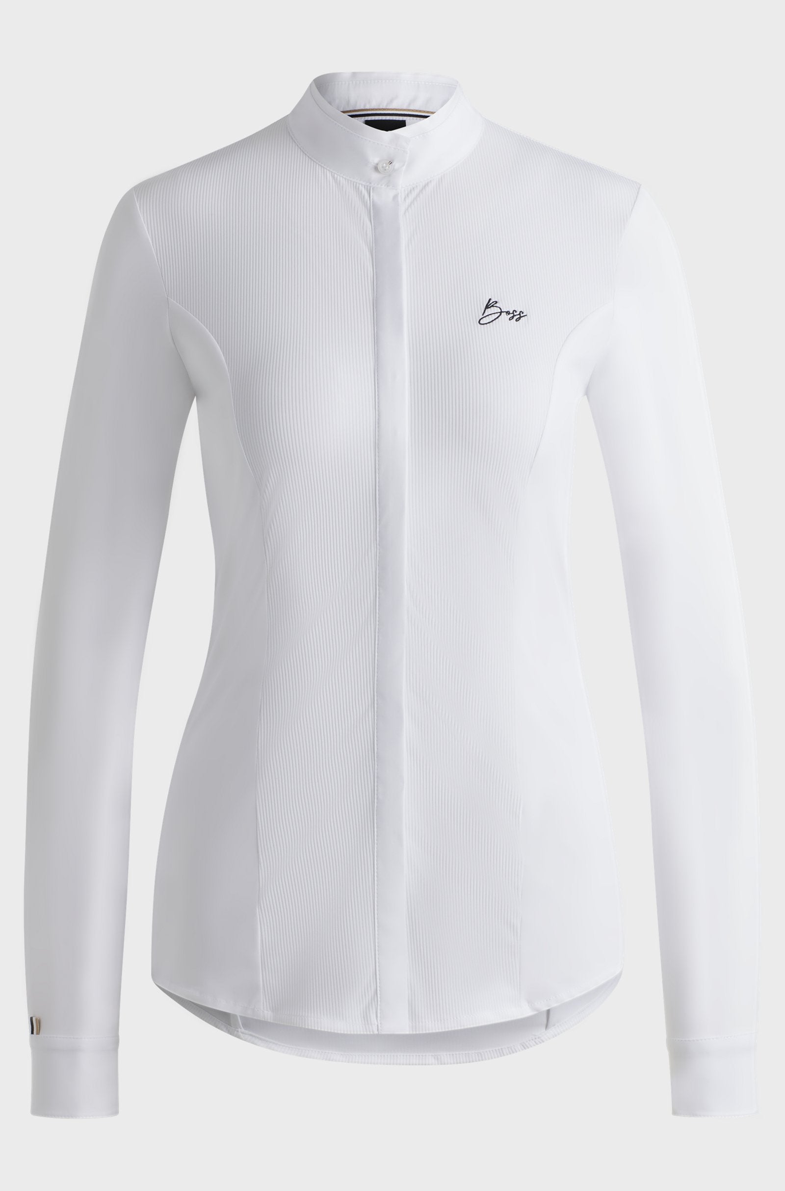 Offering exceptional stretch, sun protection and quick-dry performance, this BOSS Womenswear blouse is essential for showing. Ribbed high-tech fabric offset by contrasting stretch-cotton trims. New embroidered logo in a handwritten effect.