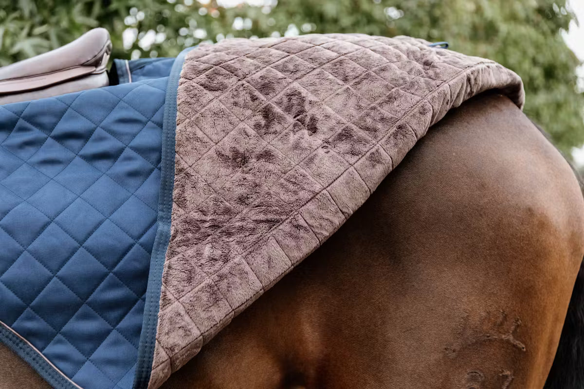 The Riding Rug has a filling of 160g and is the ideal rug for riding, warming up and cooling down when it’s cold outside. The artificial rabbit skin lining offers extra warmth because it creates tiny air pockets that retain the body heat. The lining feels very soft against the skin and polishes the horse’s coat as well as preventing rubs. The Riding Rug features a strong Velcro fastening to attach in front of the saddle, as well as a tail cord. The diamond quilting pattern, the brown artificial leather piping and the Kentucky logo in brown artificial leather give the Riding Rug a very fancy look. The rug is machine washable at 30°, no dryer.