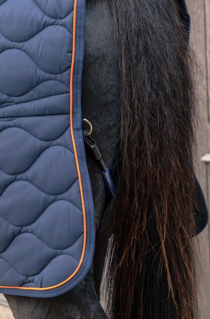 The wave quilted outer fabric in 600D polyester is very resistant to tearing. The Inner fabric Is smooth and avoid the risk of rubbing. This rug also features a detachable elastic cord with plastic protection. Available In Dark Green and navy with an elegant orange cord.