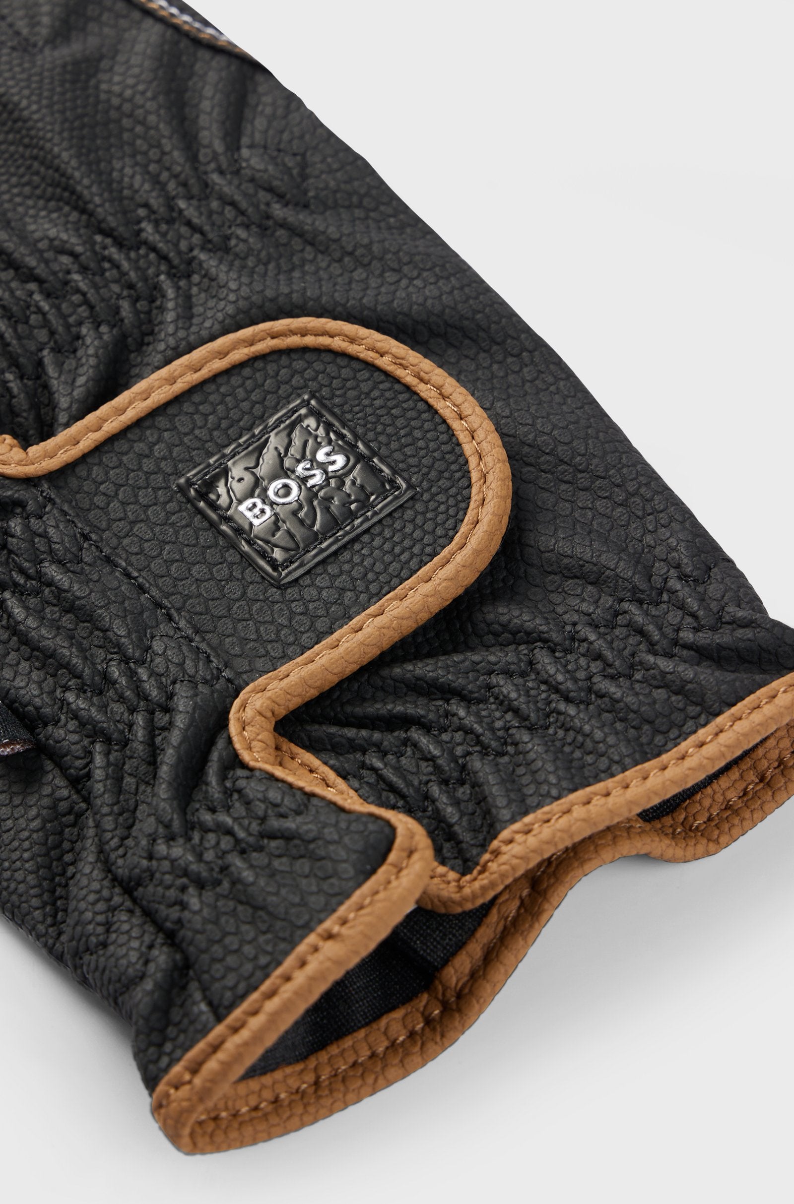 Machine-washable riding gloves by BOSS. Made in synthetic coated fabric that offers an unbeatable grip and long-lasting comfort, these riding gloves have a riptape closure for a close and secure fit. Branded details add a timeless finish to this expertly crafted pair. Synthetic coated fabric, sometimes referred to as faux leather, is a fabric designed to resemble real leather, and/or display a matte, glossy, smooth, or textured, coated appearance.