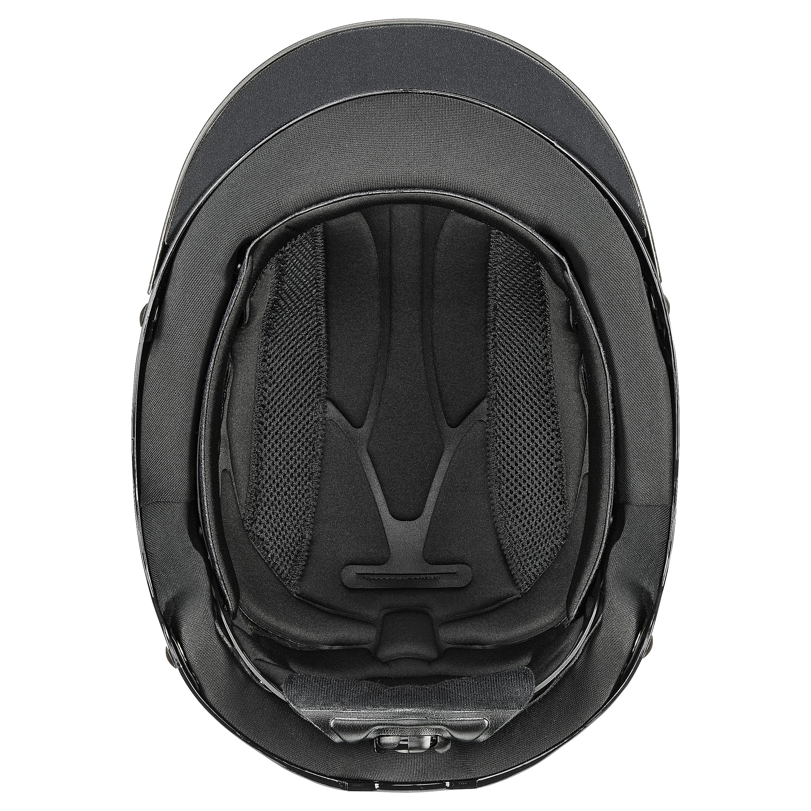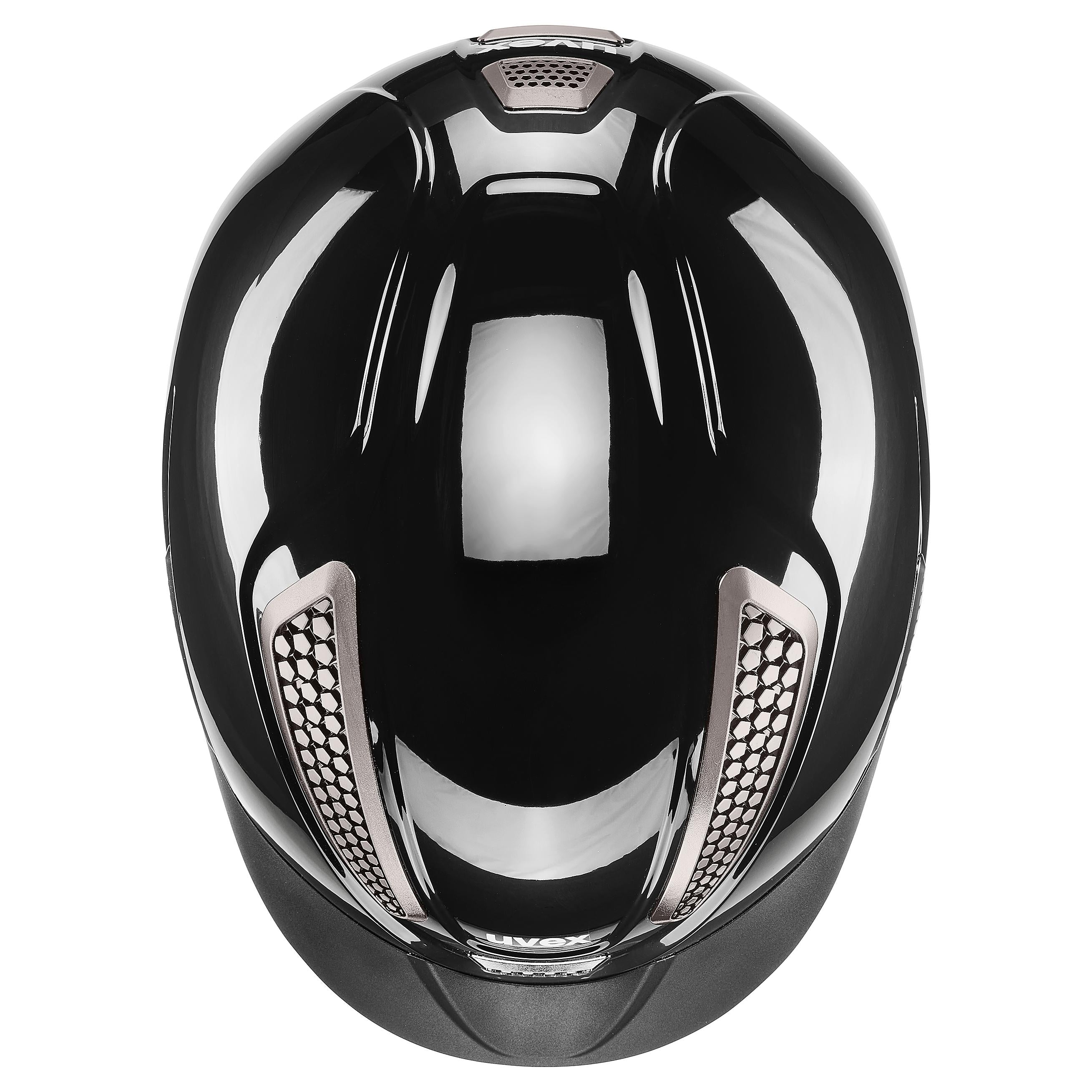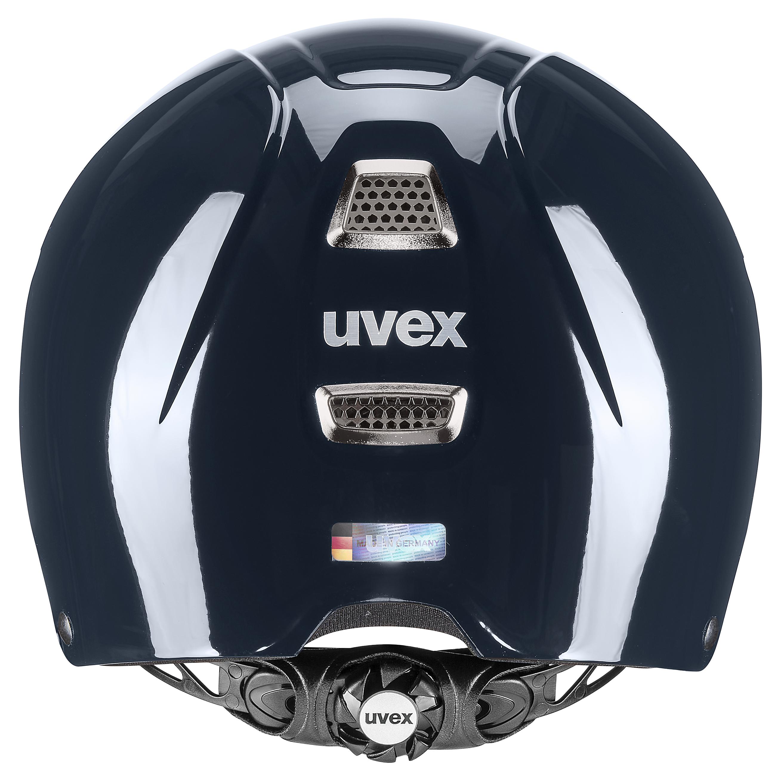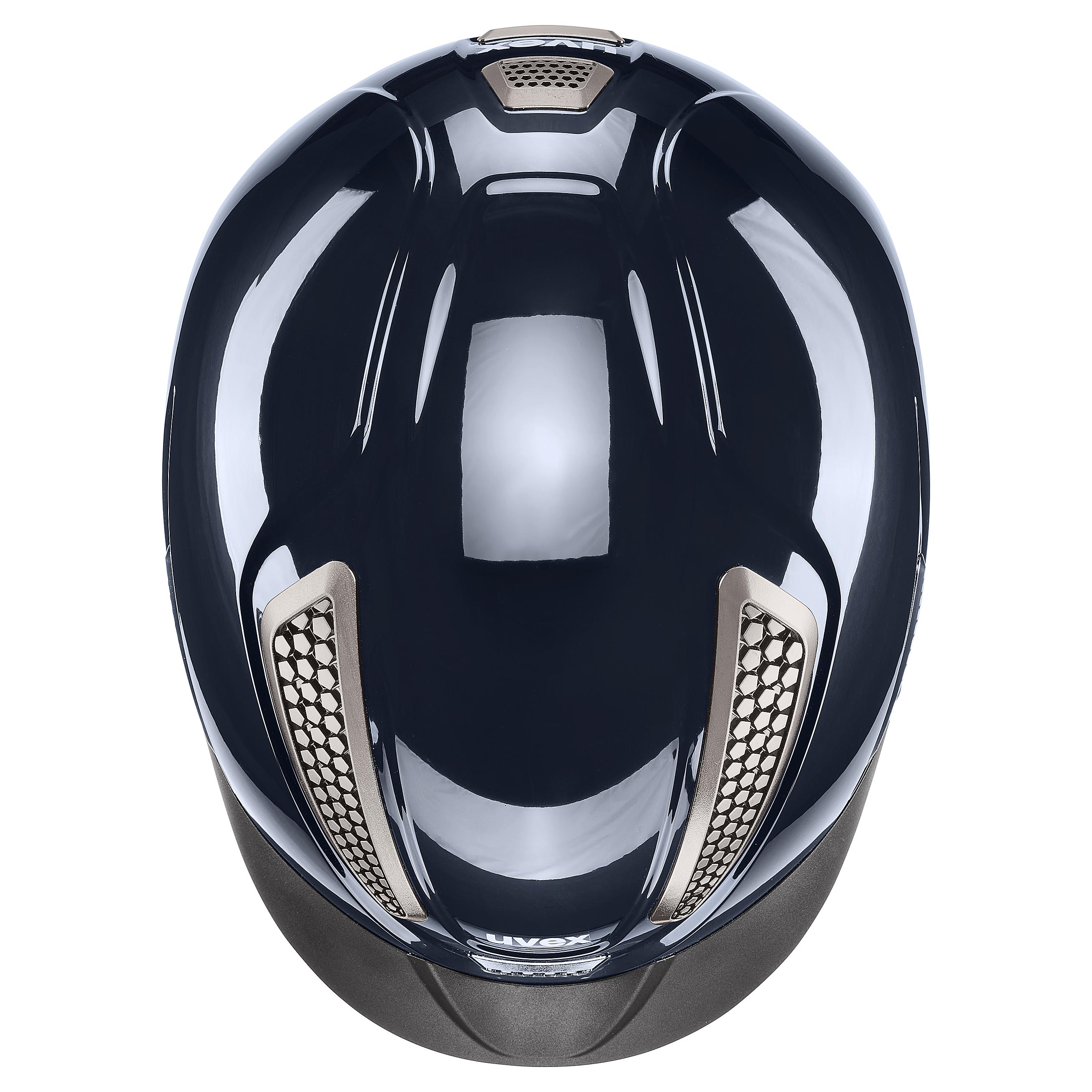 The uvex perfexxion III is the ultimate combination of a sporty look, great temperature control and protection €“ especially with its piano-like glossy shell and striking metal-black chrome grilles. It also provides safety innovations, such as the external shell extended down the back of the head for more protection, as well as a ponytail cut-out for a comfy fit. The slimline shape of the uvex perfexxion III helmet ensures it€™s really lightweight €“ and ergonomically perfectly suited to the demands of energetic riding. Our uvex dynamic ventilation combines a futuristic design with optimal temperature control. The helmet€™s large air vents, combined with a honeycomb structure, ensure perfect temperature control at all times. You€™ll also find it really comfortable due to the modern vegan leather straps, which you can easily adjust with the newly-developed Y-divider. The washable, soft inner pads with memory foam and the 3D IAS size adjustment feature always ensure a perfect fit for every rider.