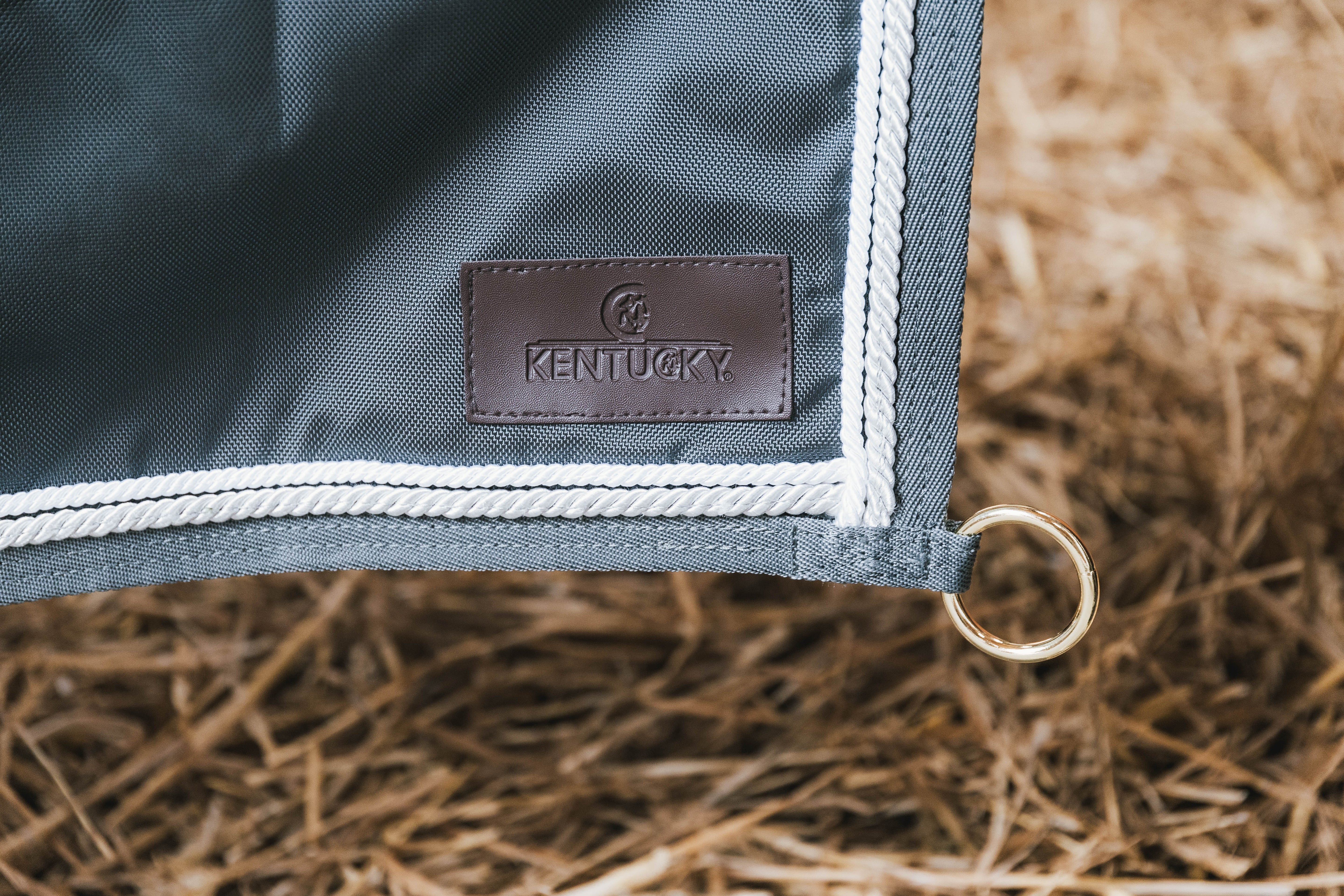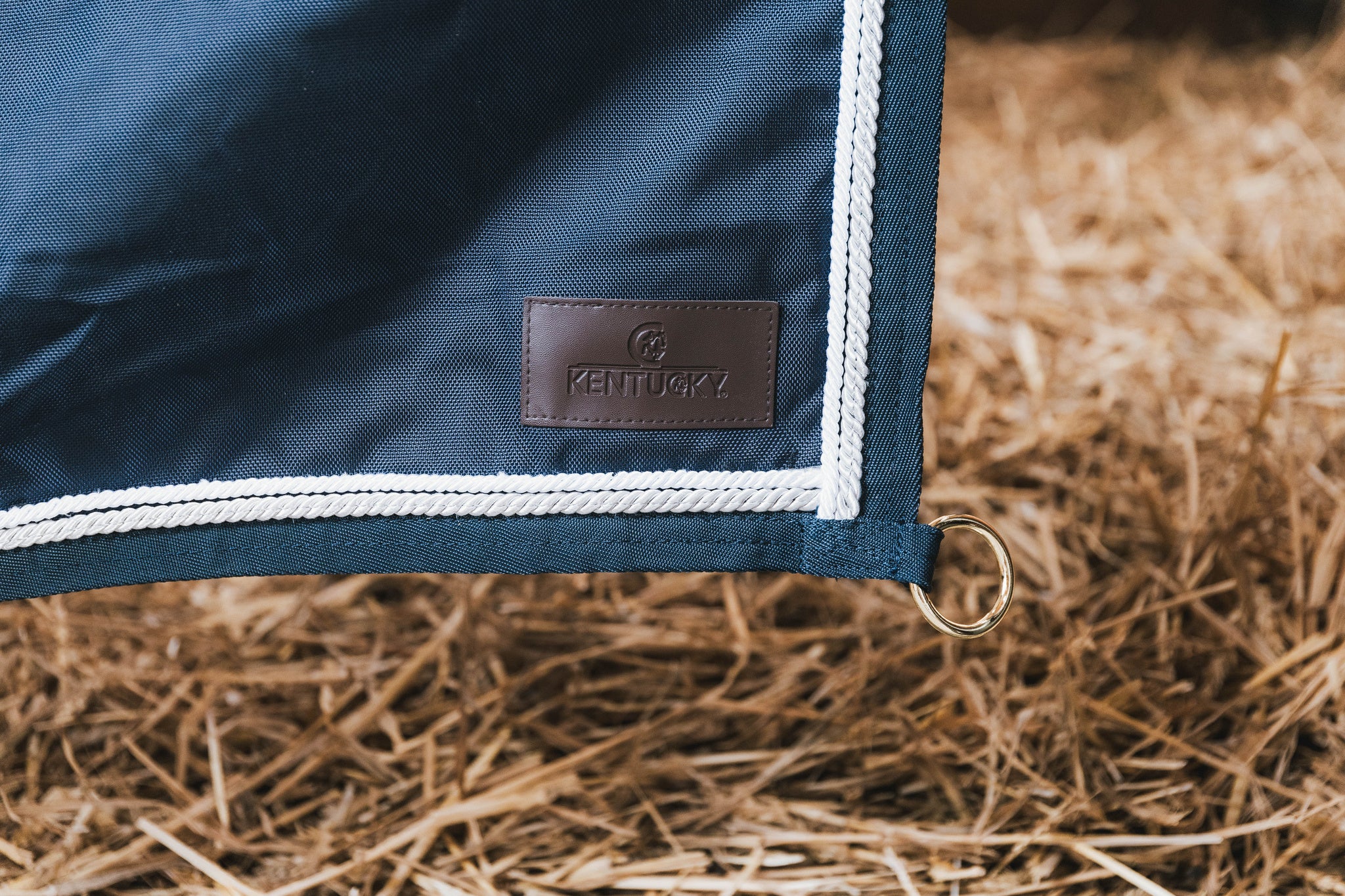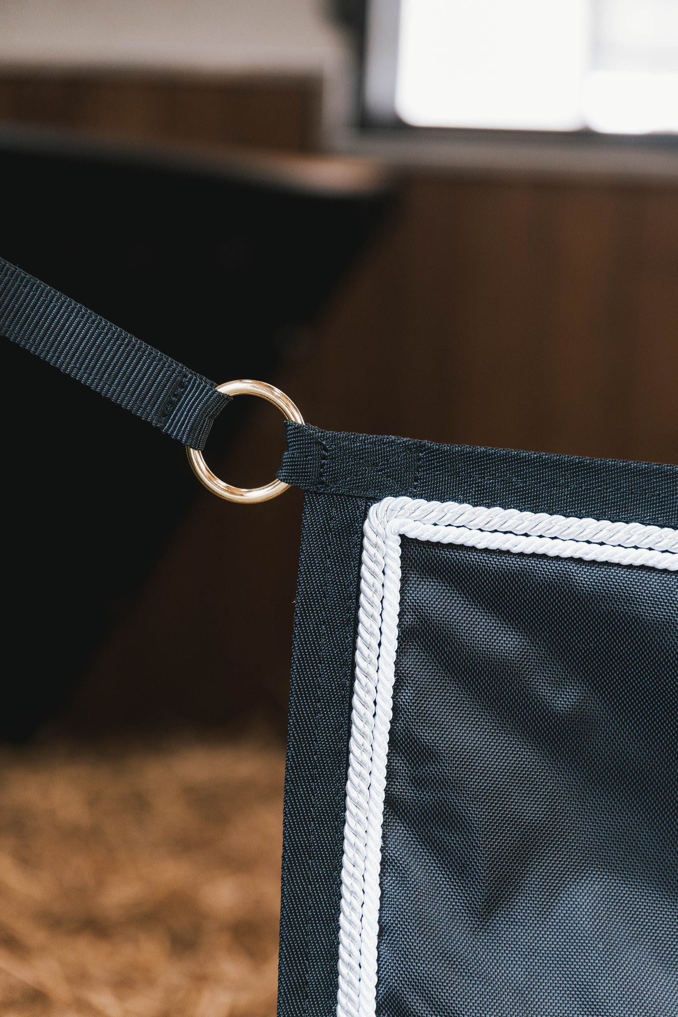 Featuring two reinforced gold-colored rings in the top corners and a strong nylon strap with a snap hook for quick installation, this guard also includes two bottom rings for added security. The double binding ropes elevate the overall aesthetic, making it an ideal piece for those who value both function and style. Personalize it by adding your own embroidered logo, and complete the look with our matching Stable Curtain Classic and Stanley Cover Classic.