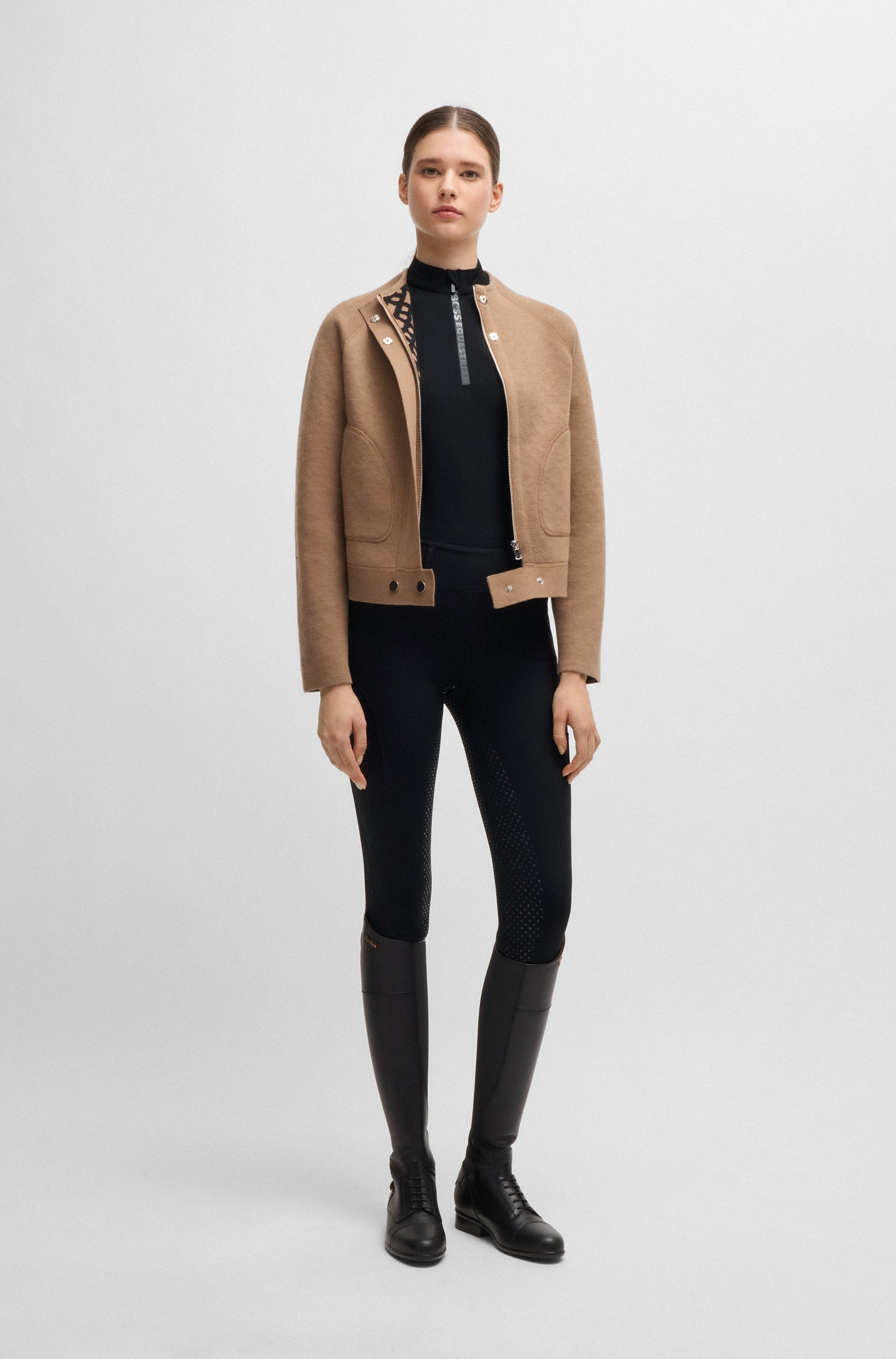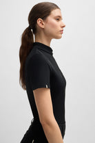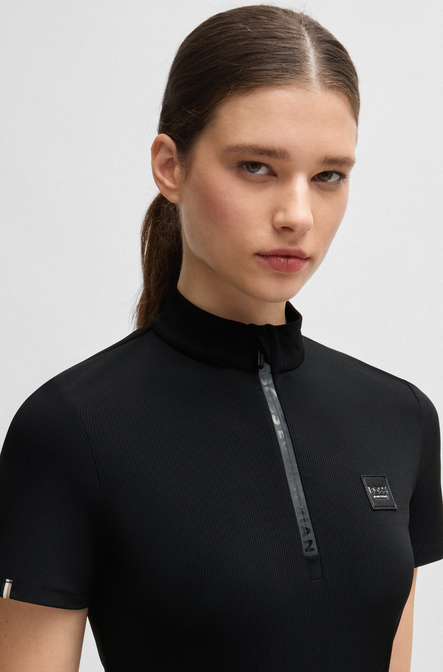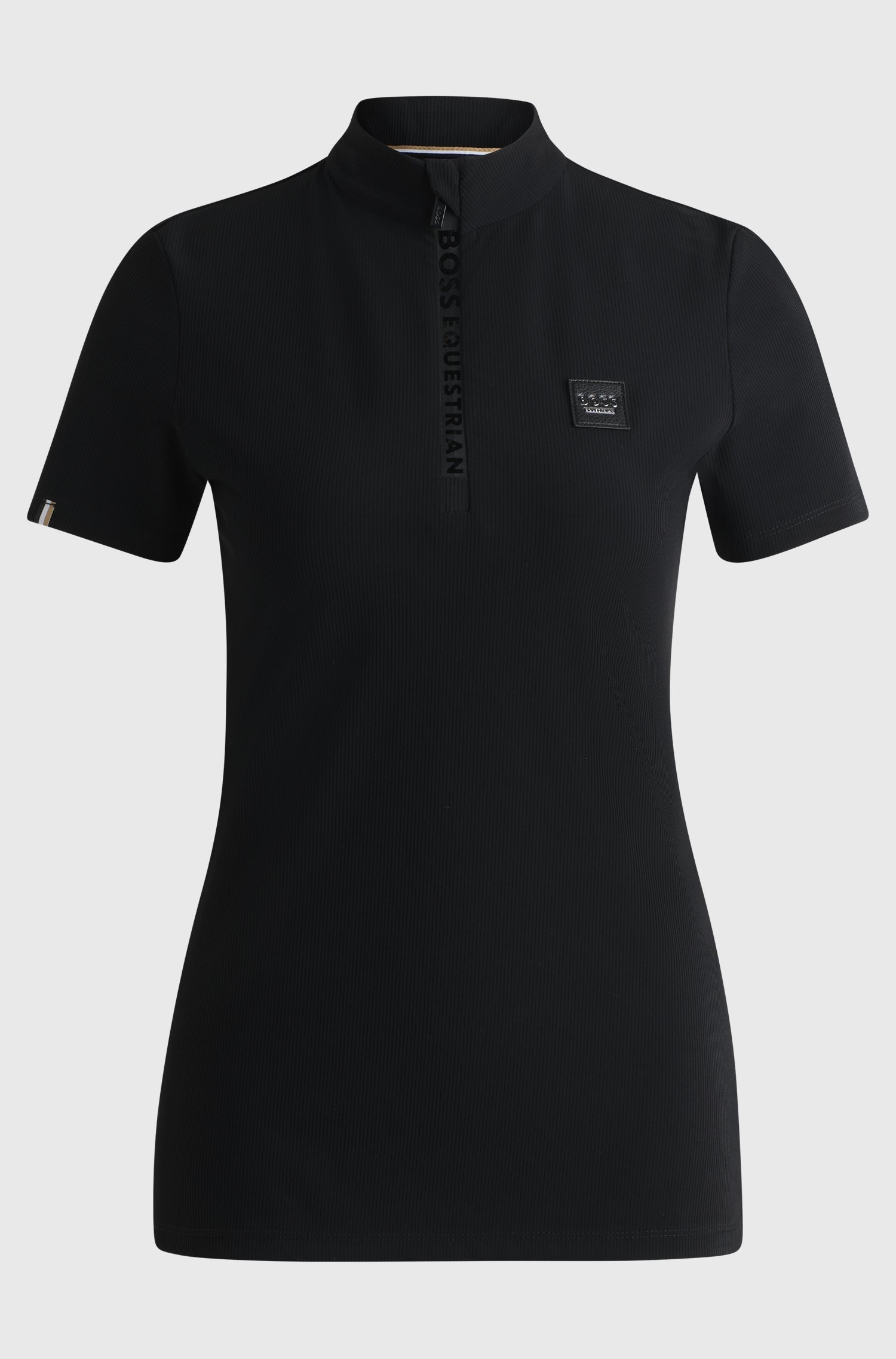 Show shirt with half sleeves and front zip. The zip is printed with a discreet tonal BOSS Equestrian logo. There is a faux leather patch with the BOSS logo on the chest. The power sport fabric has a ribbed look, giving it a new texture.