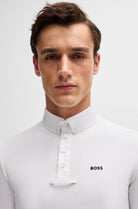 Show shirt with half sleeves and half button placket at the front with signature stripe trim. There is a BOSS logo as an imitation leather patch on the chest. The power sport fabric has a piqué look and a new texture.