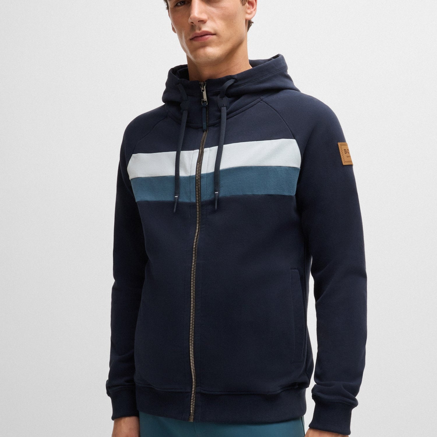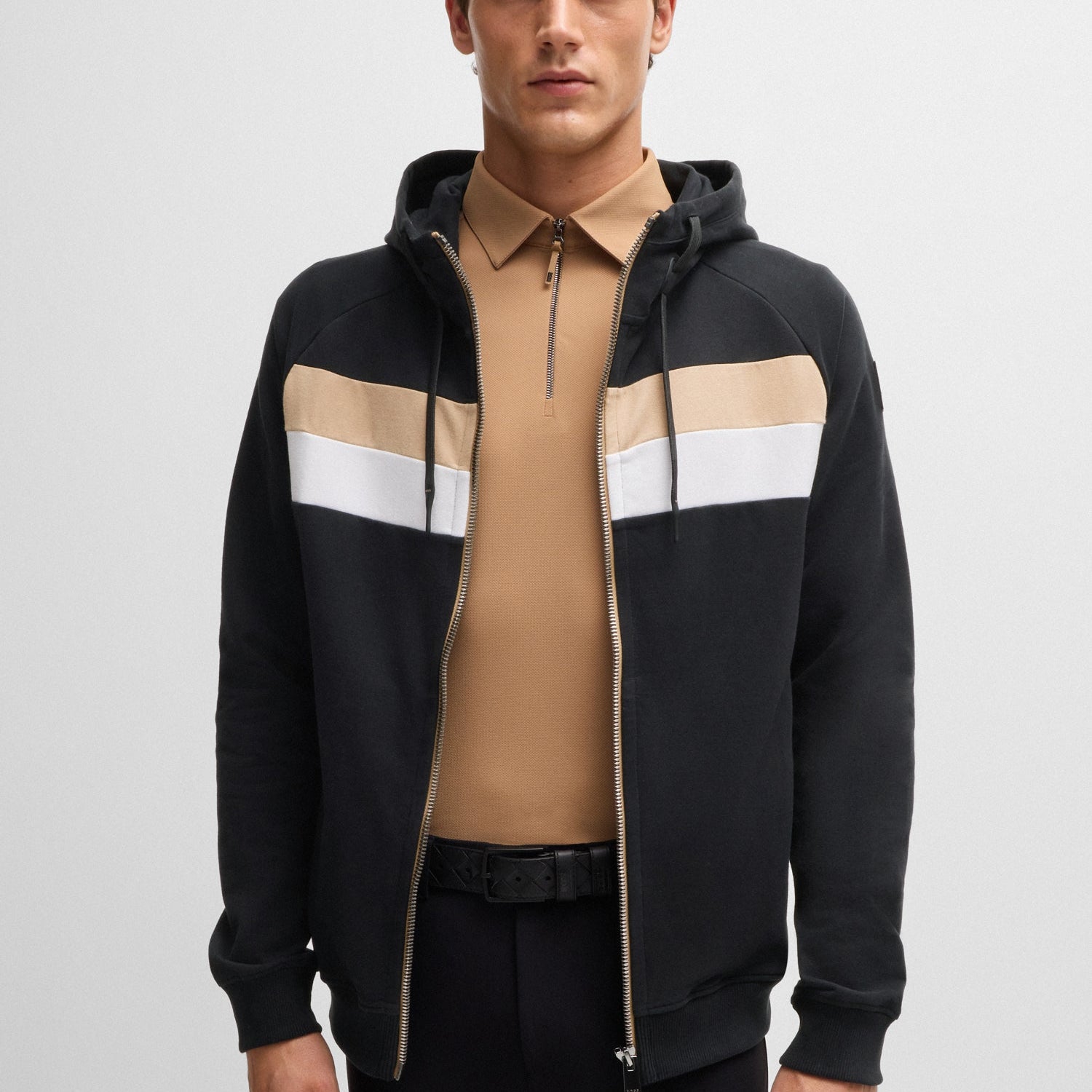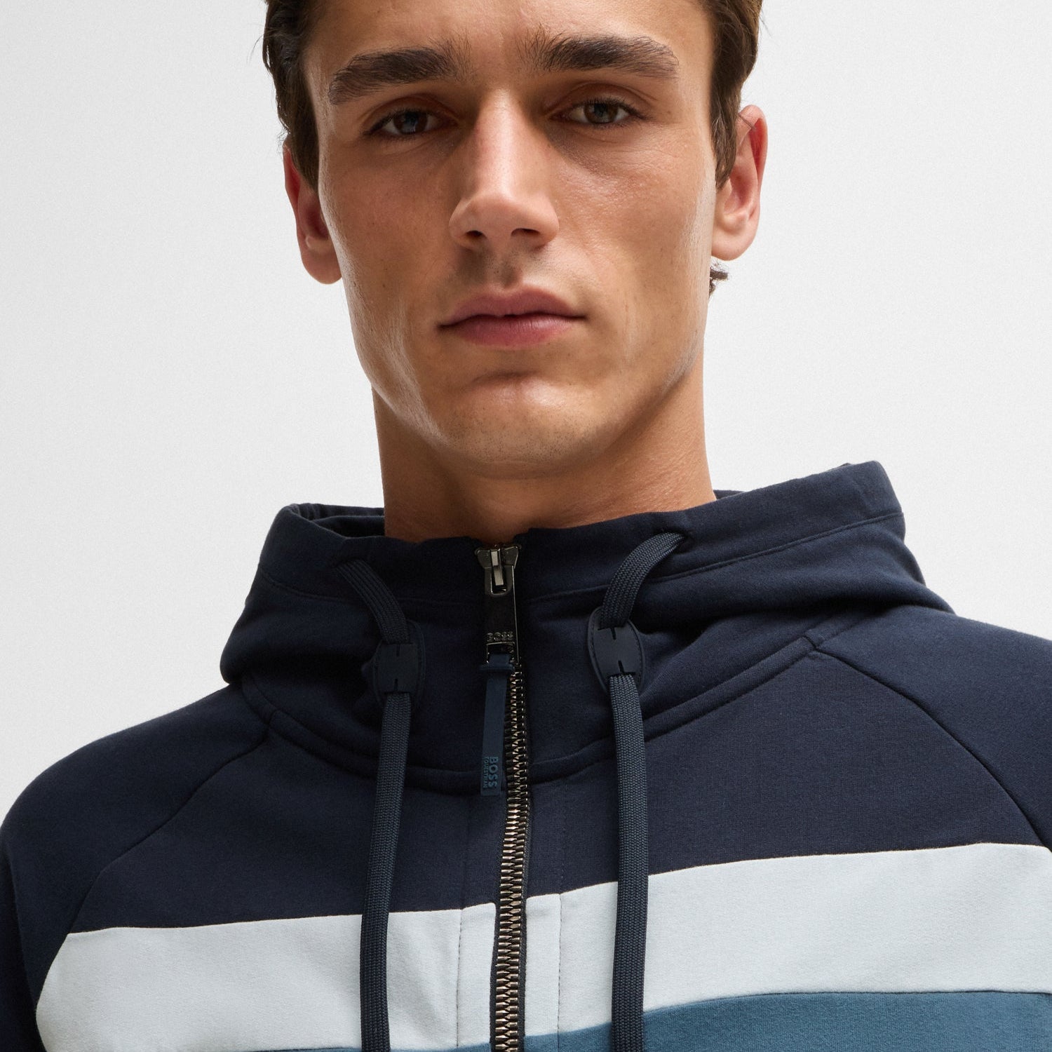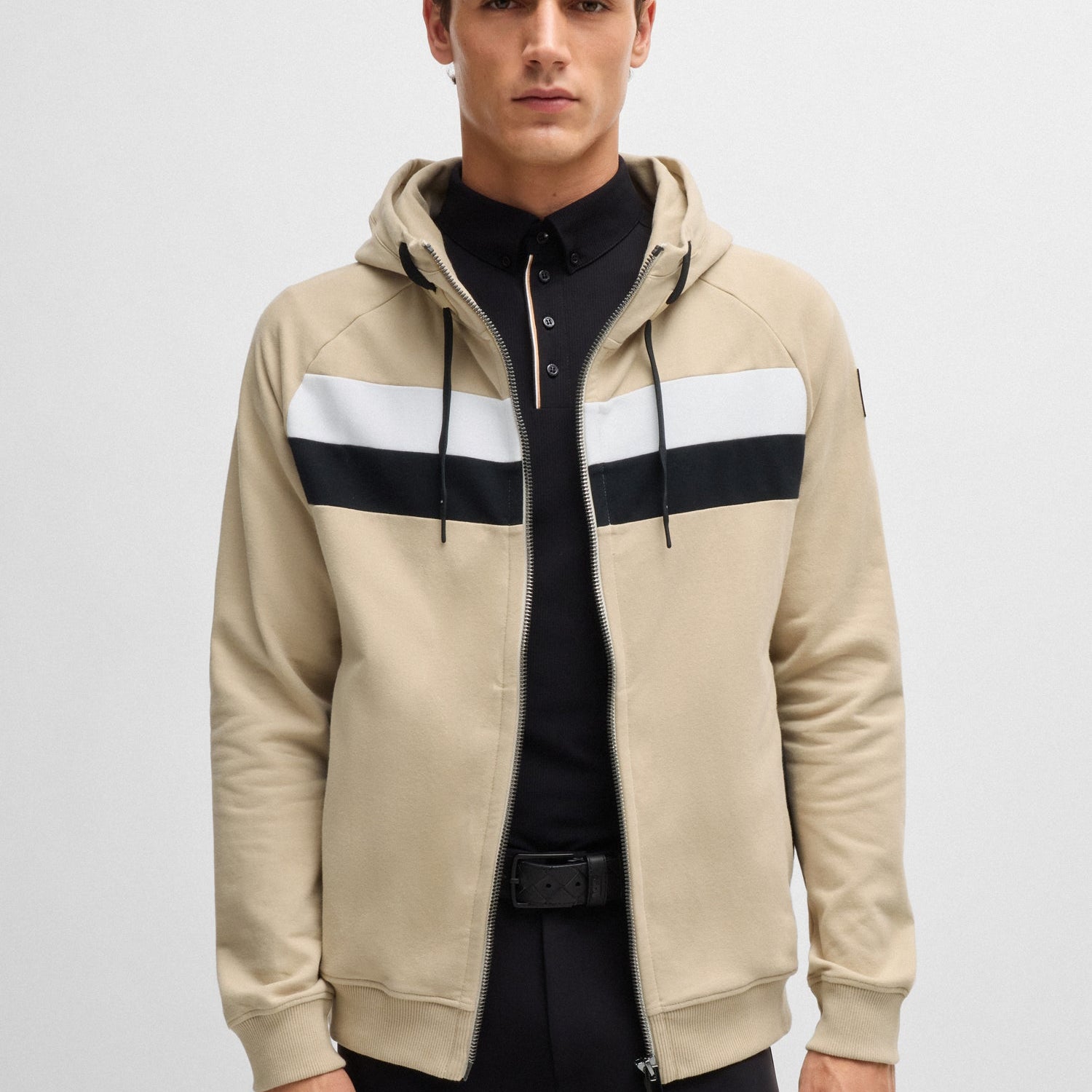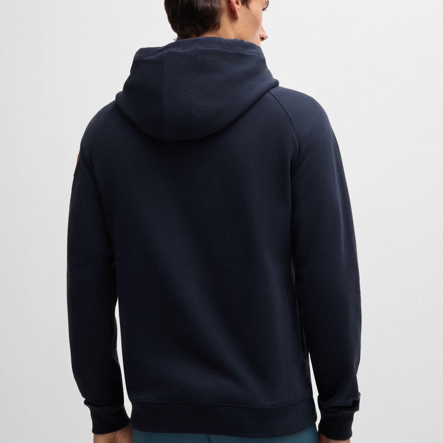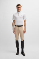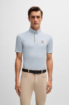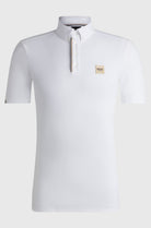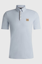 Show shirt with half sleeves and half button placket at the front with signature stripe trim. There is a BOSS logo as an imitation leather patch on the chest. The power sport fabric has a piqué look and a new texture.
