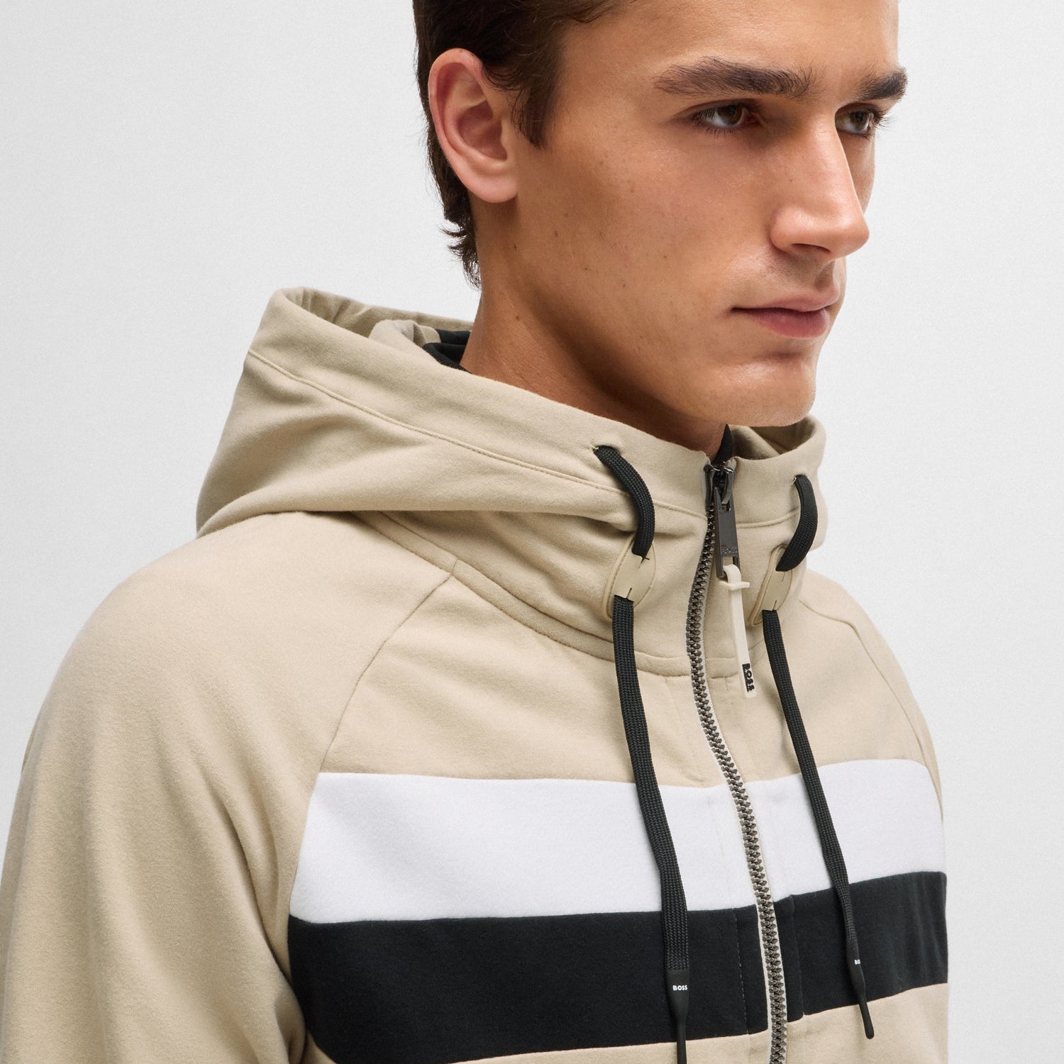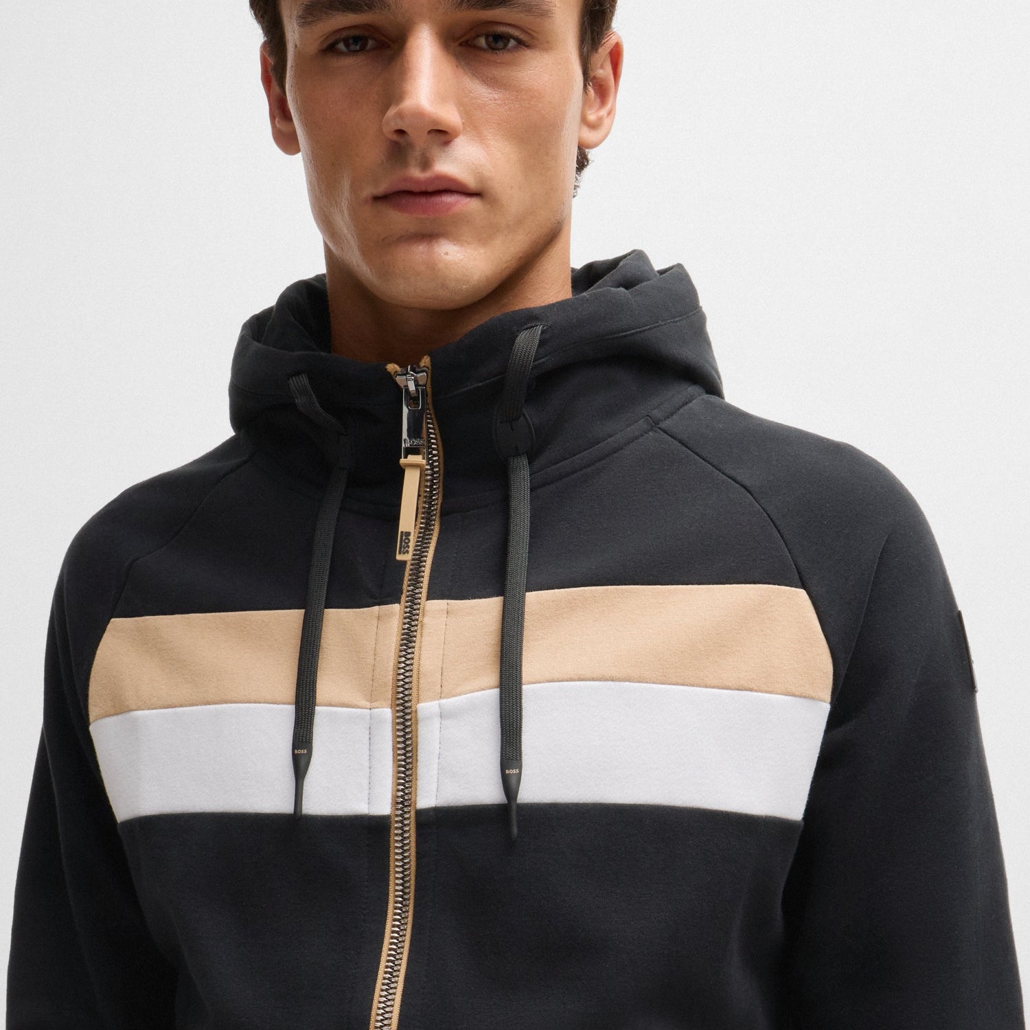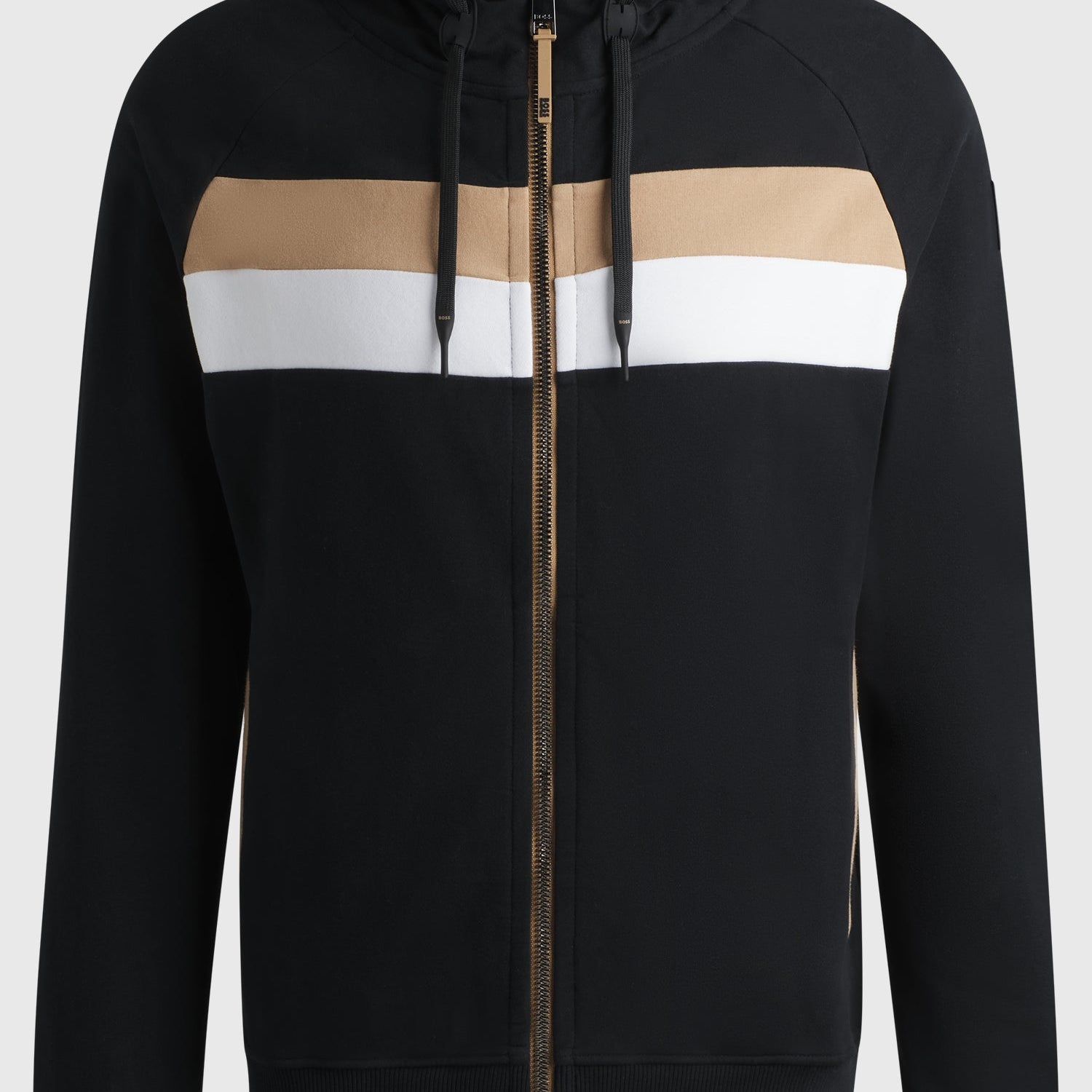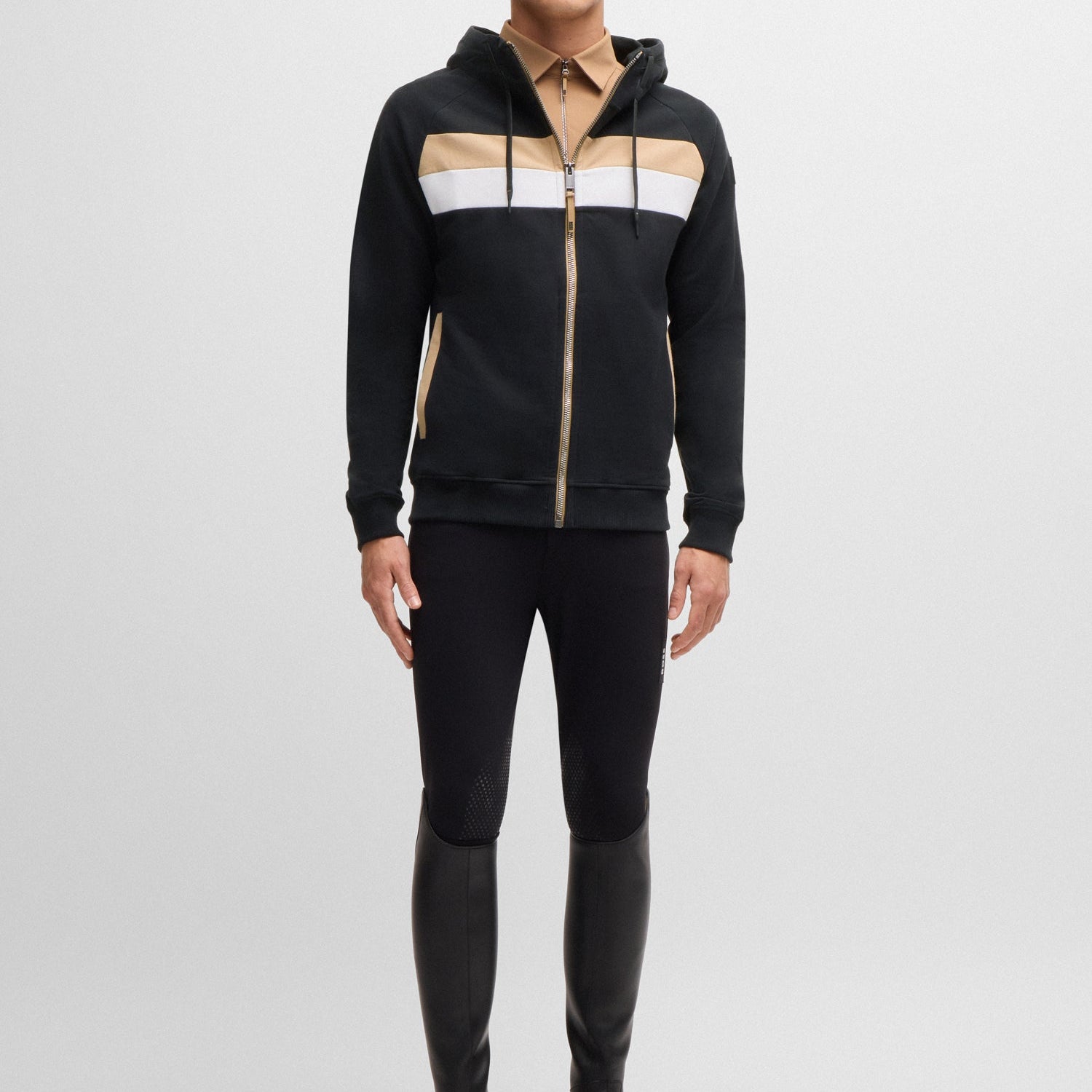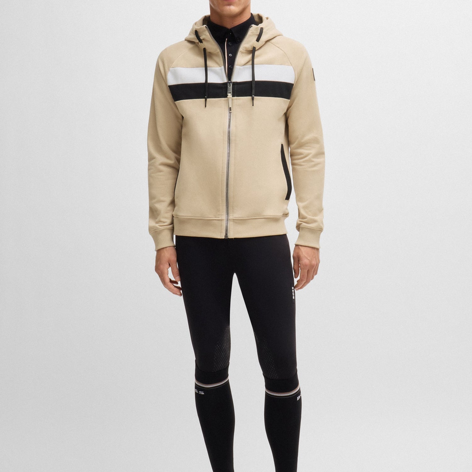 Show shirt with half sleeves and half button placket at the front with signature stripe trim. There is a BOSS logo as an imitation leather patch on the chest. The power sport fabric has a piqué look and a new texture.