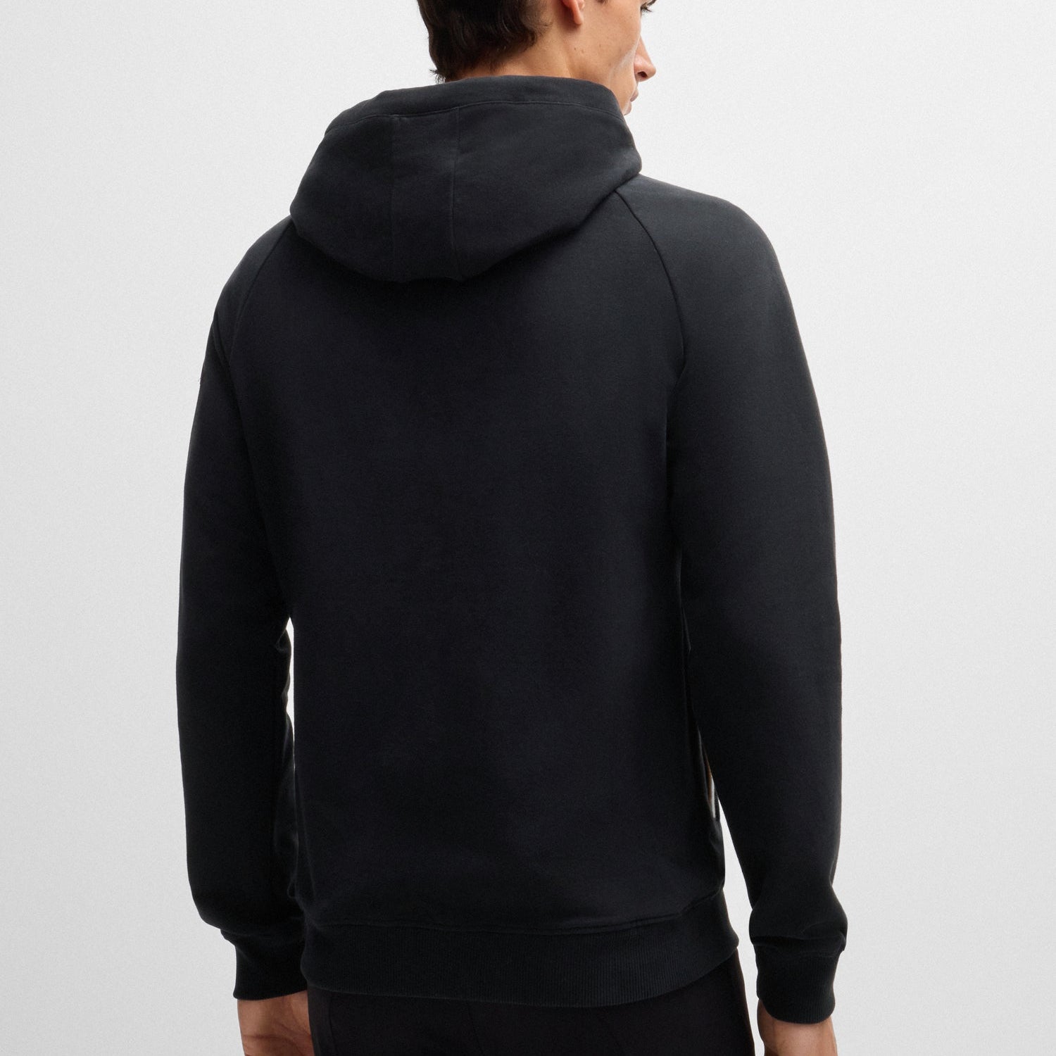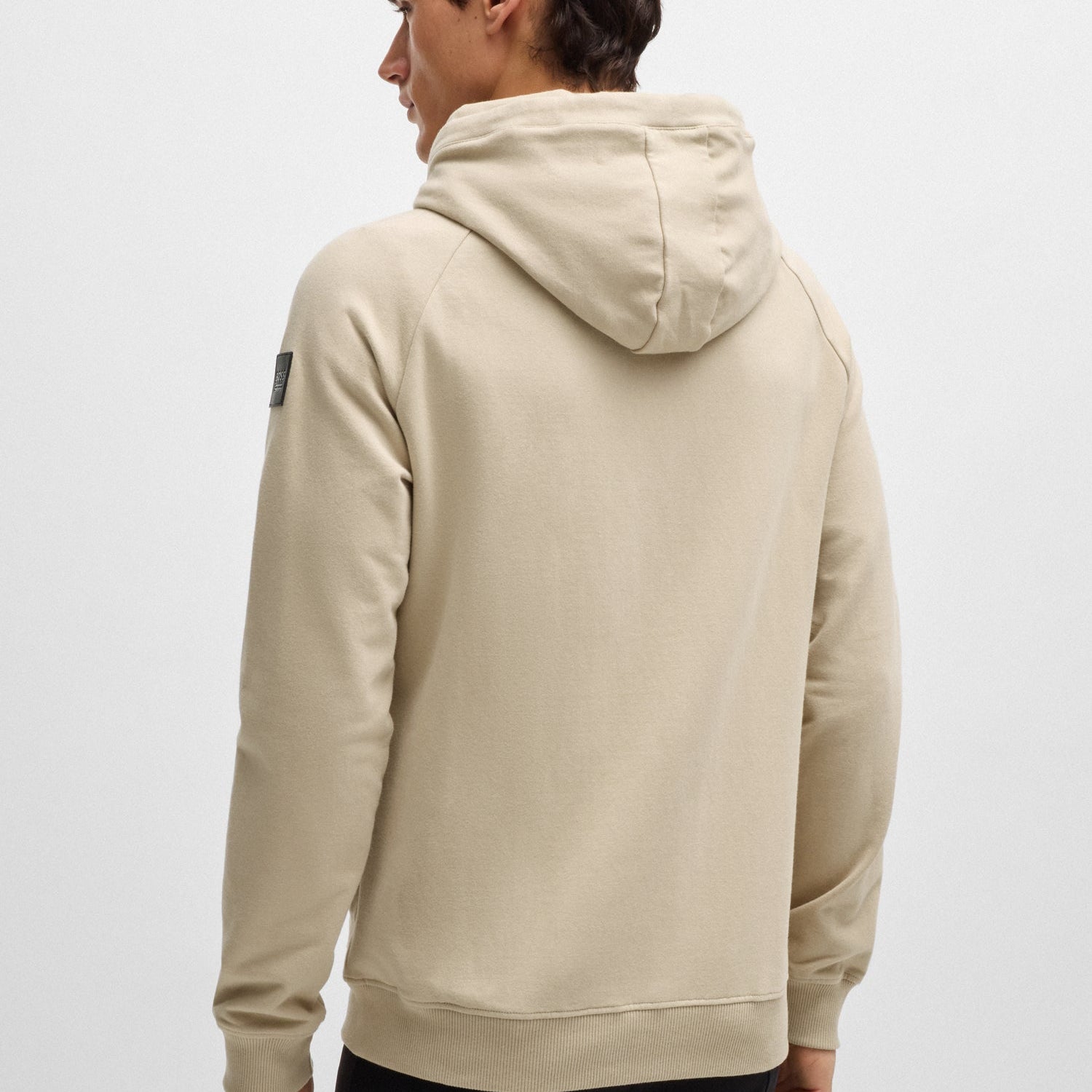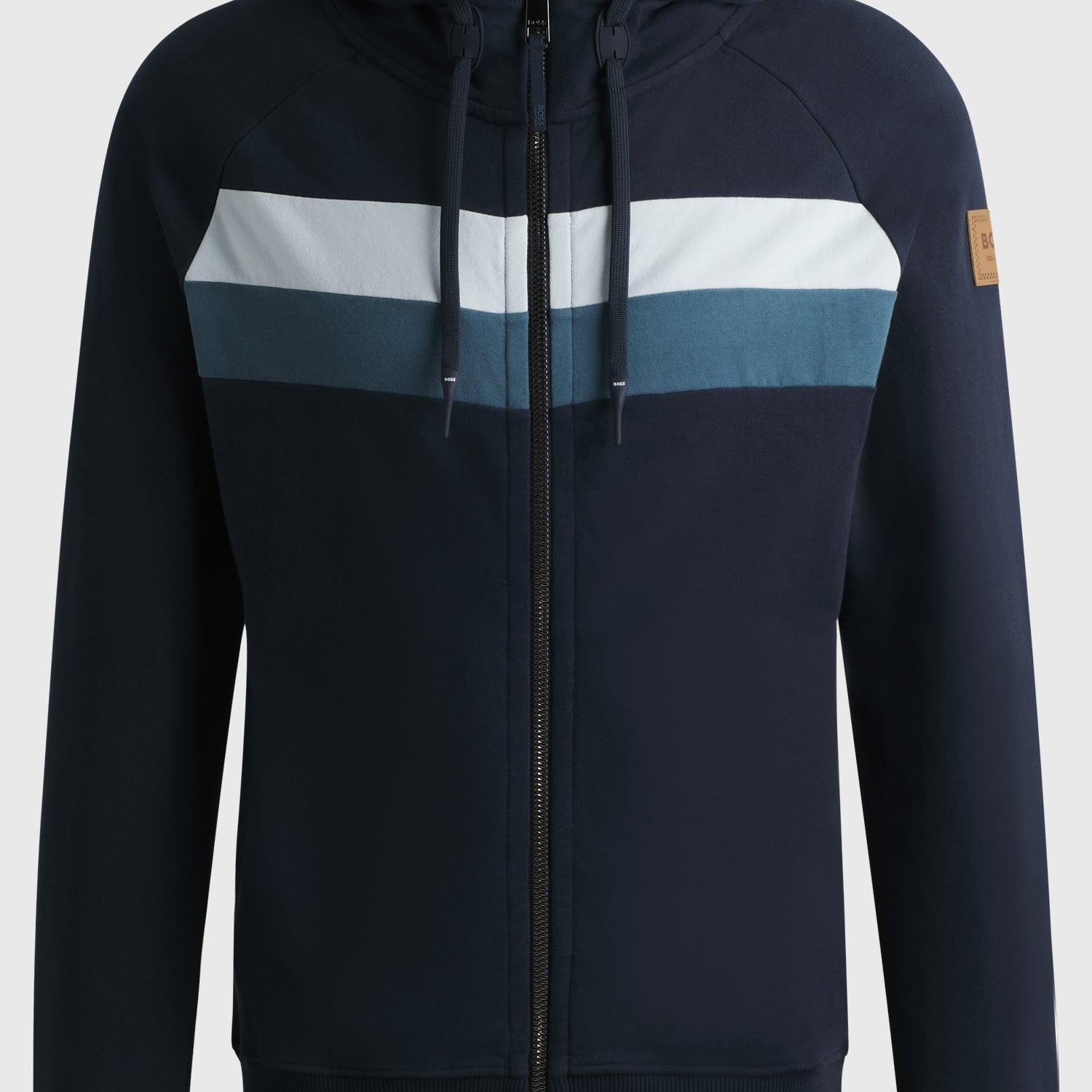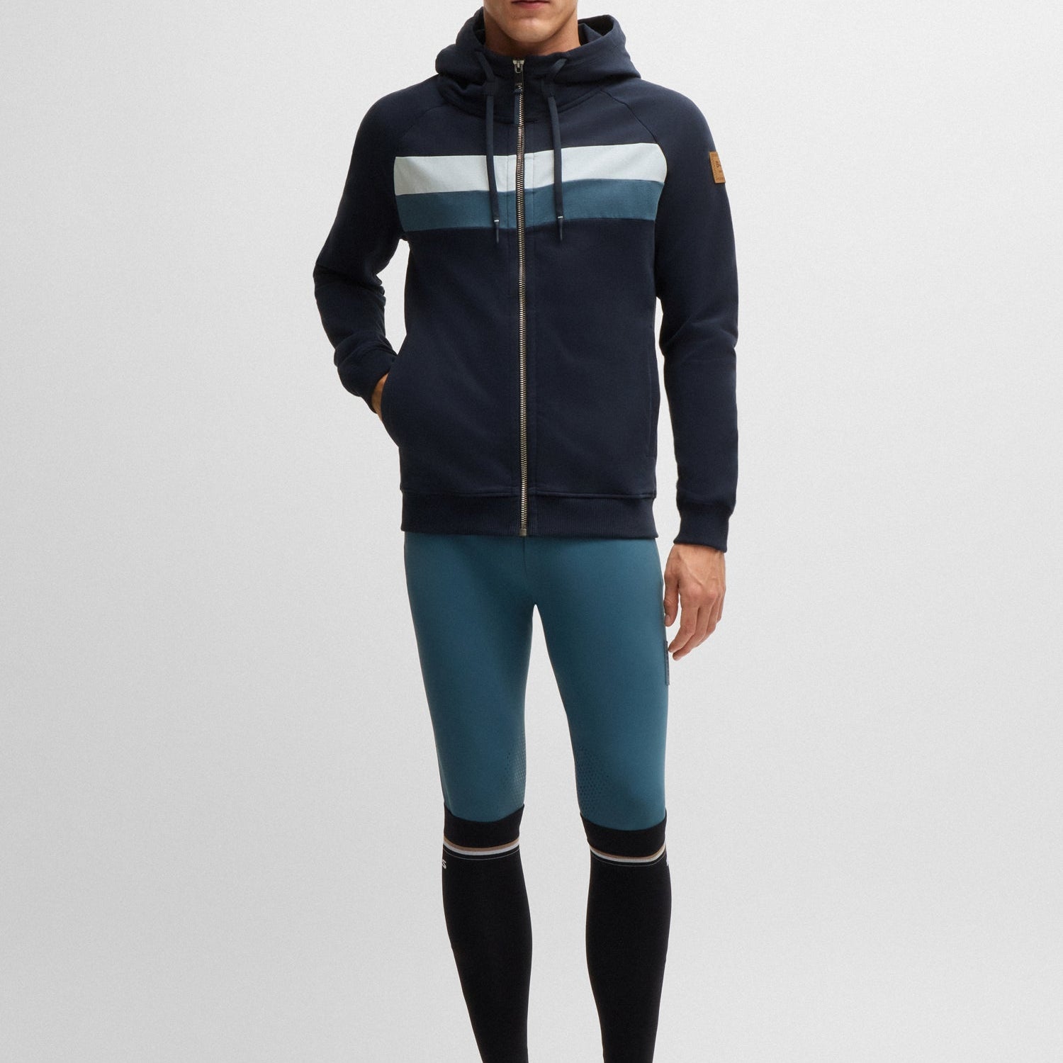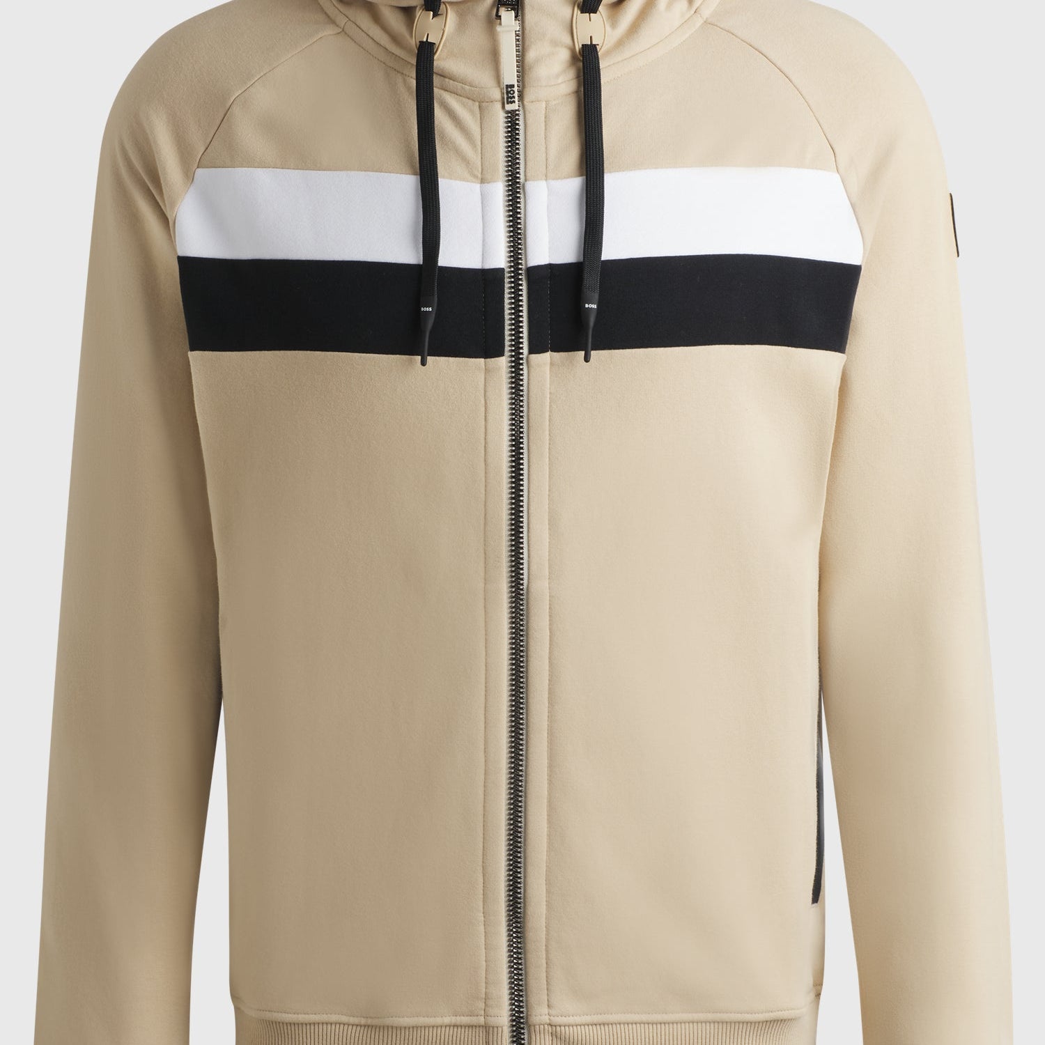 Show shirt with half sleeves and half button placket at the front with signature stripe trim. There is a BOSS logo as an imitation leather patch on the chest. The power sport fabric has a piqué look and a new texture.