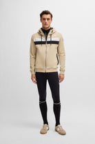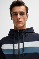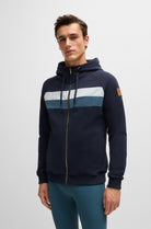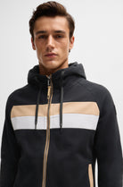 Bestselling zip hoodie with side pockets. With 2 contrasting stripes at chest height and an imitation leather BOSS Equestrain LOGO patch on the left upper arm. Super soft Italian sweat fabric with stretch and brushed inside for soft comfort.