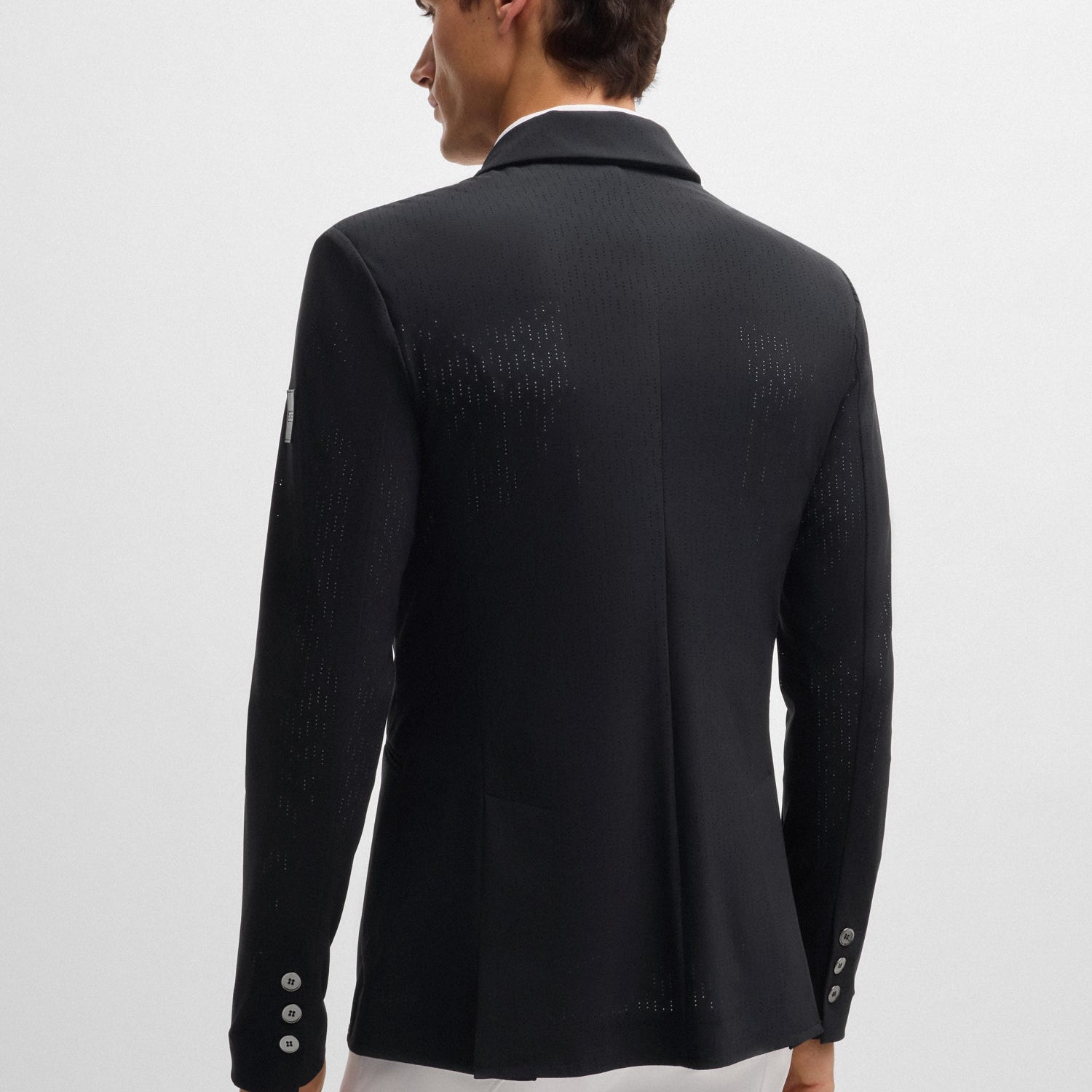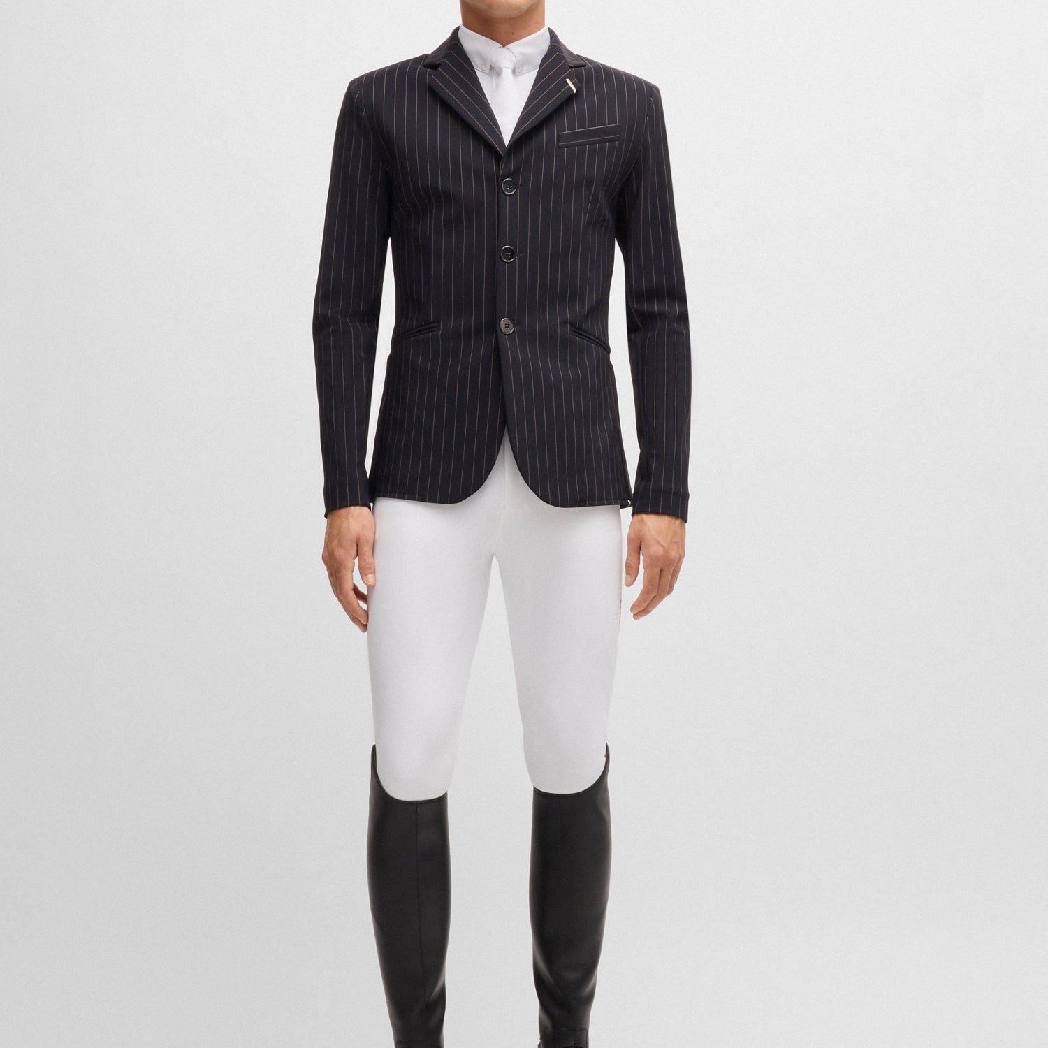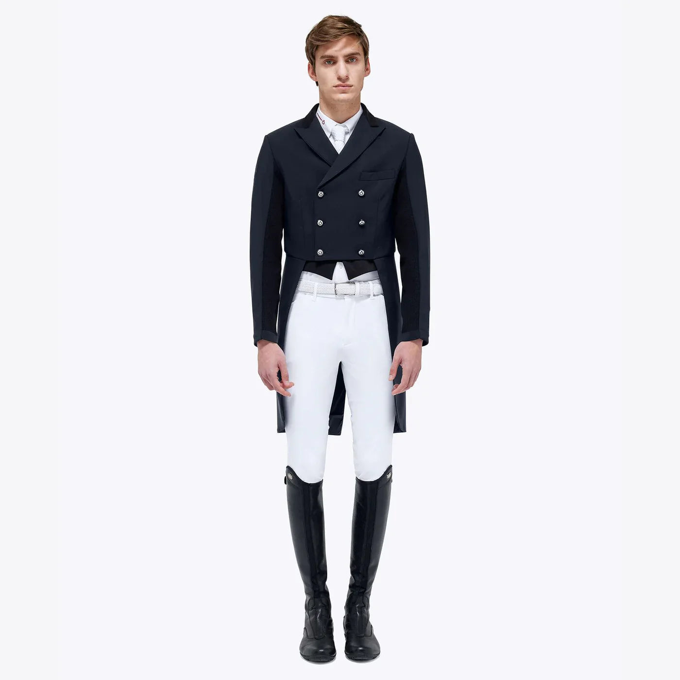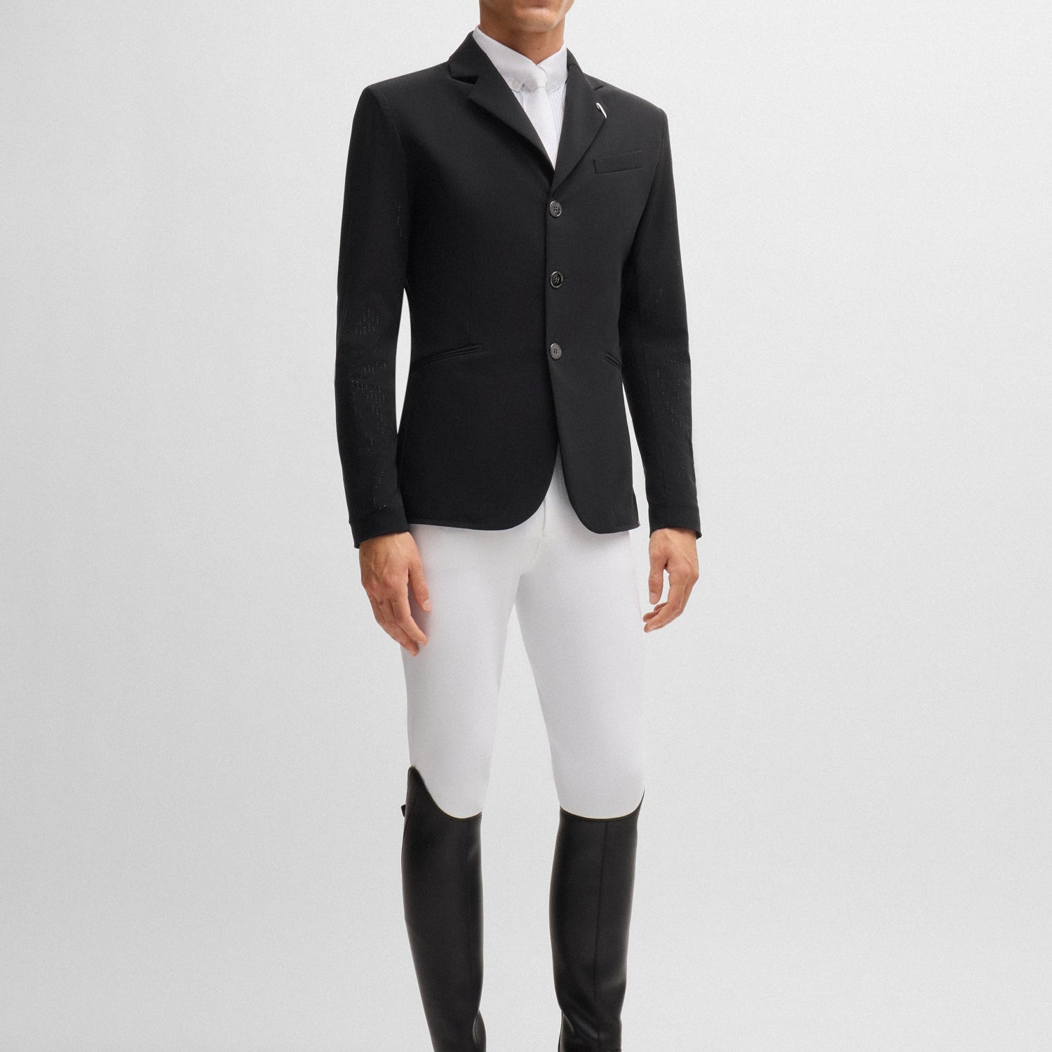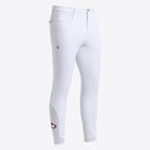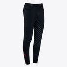 The men's full-grip dressage breeches offer a perfect fit in the saddle without restricting movement. Crafted from 4-way stretch technical jersey, they combine elegance with performance. The fabric provides excellent breathability, antibacterial properties, and UV protection, making them ideal for sports activities. The breeches feature two front pockets and two back pockets with buttons, complemented by a small embroidered logo on the thigh and elastic cuffs.