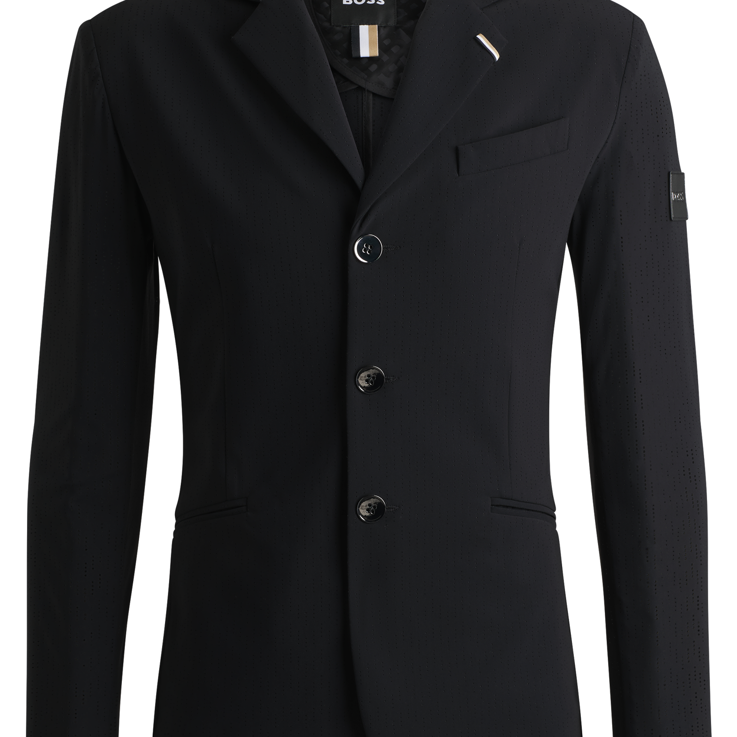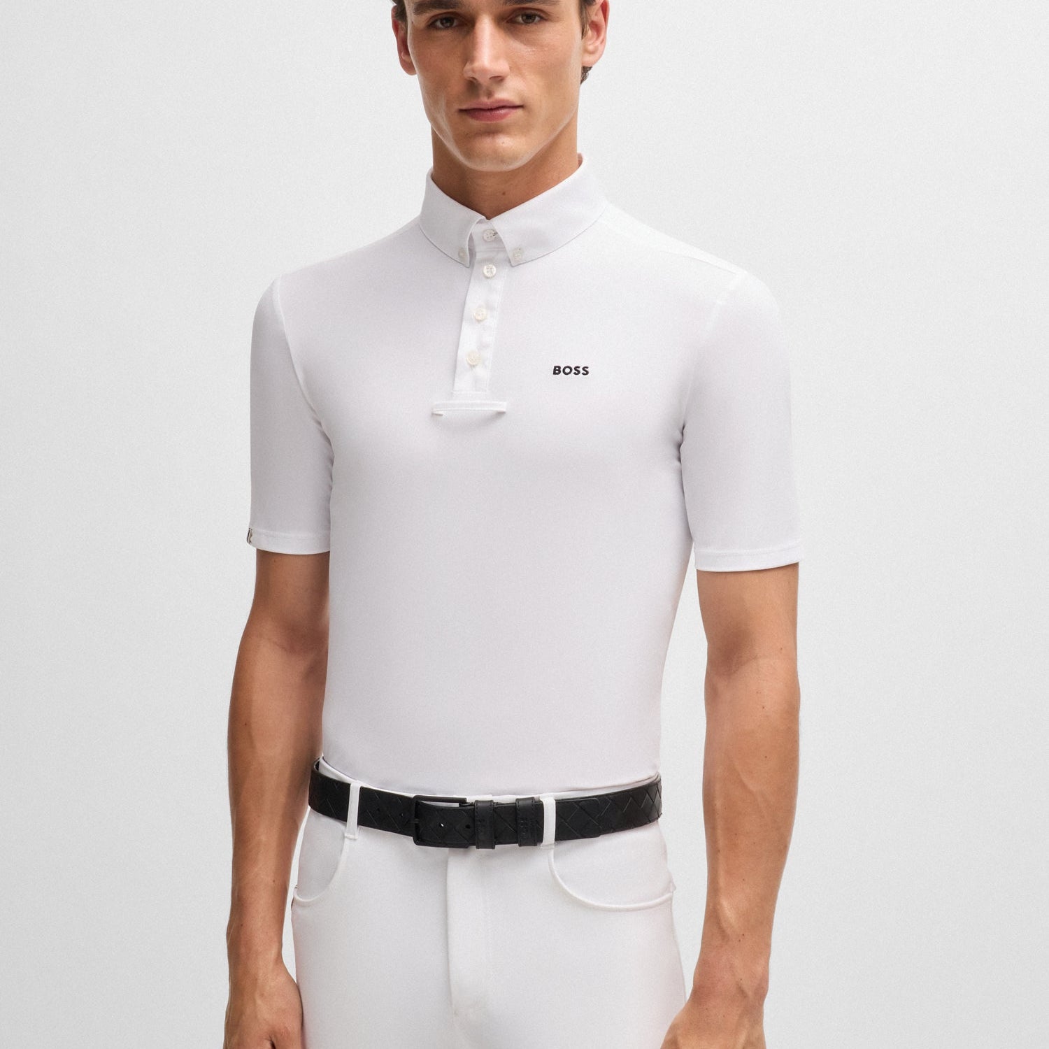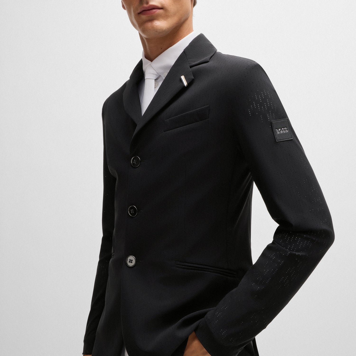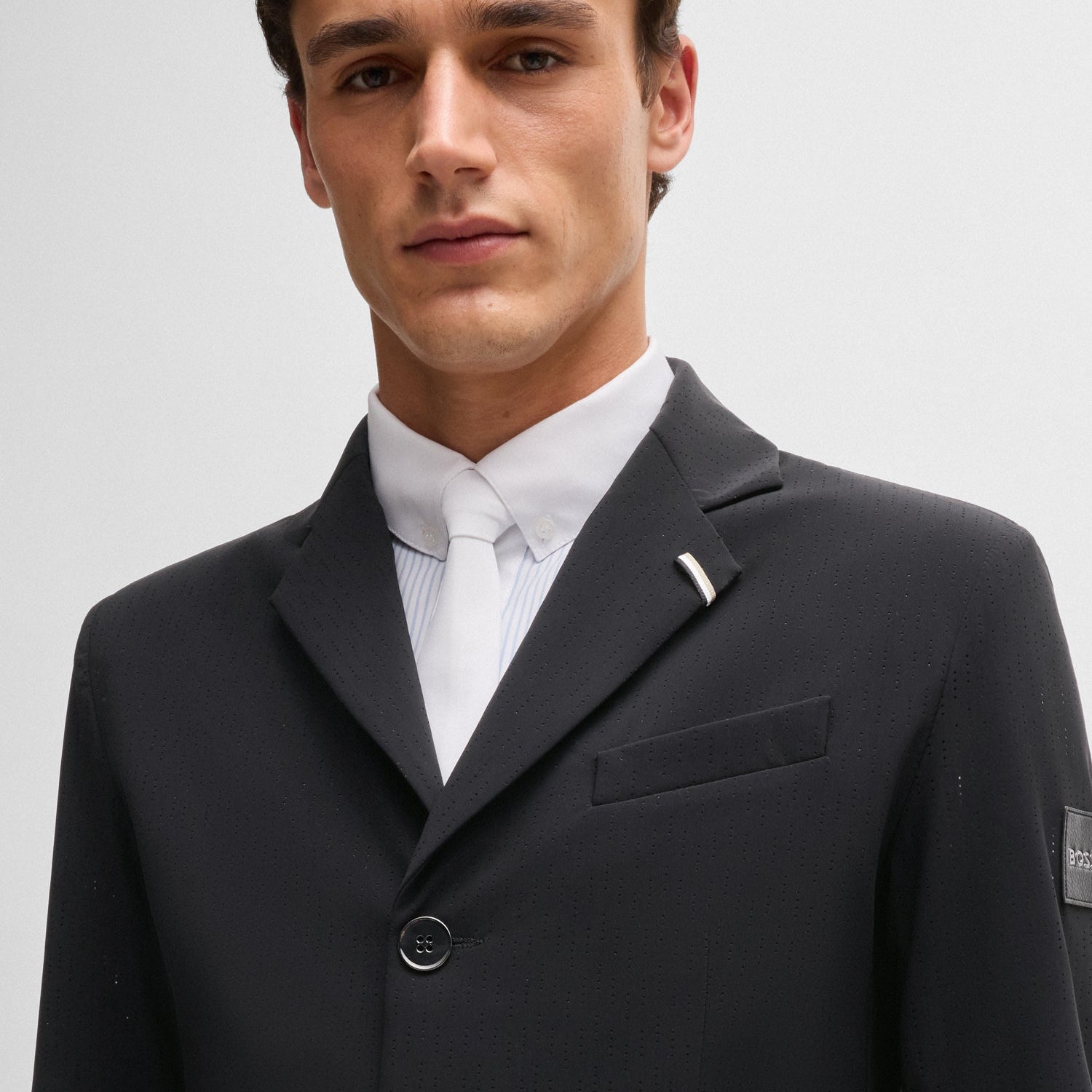 The men's full-grip dressage breeches offer a perfect fit in the saddle without restricting movement. Crafted from 4-way stretch technical jersey, they combine elegance with performance. The fabric provides excellent breathability, antibacterial properties, and UV protection, making them ideal for sports activities. The breeches feature two front pockets and two back pockets with buttons, complemented by a small embroidered logo on the thigh and elastic cuffs.
