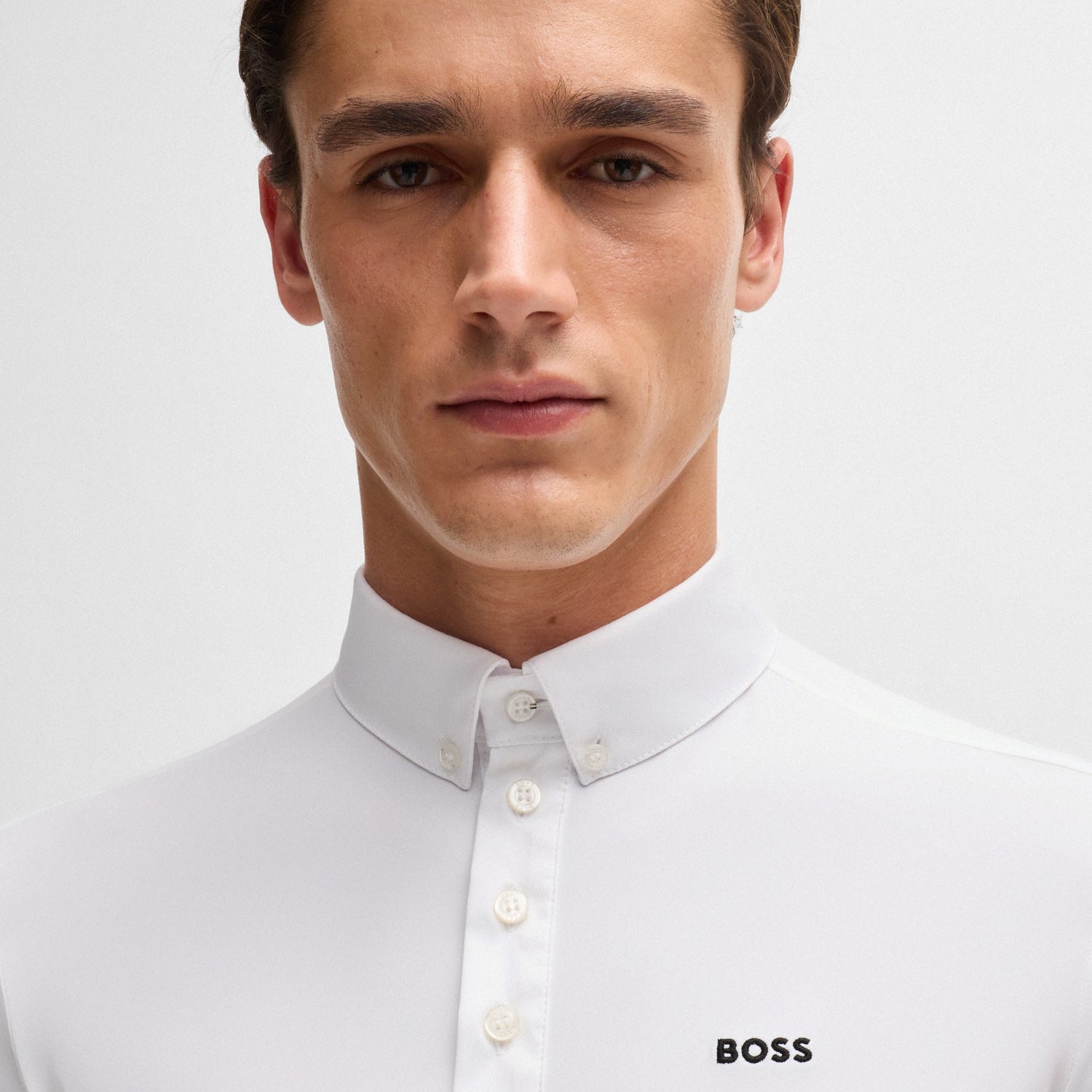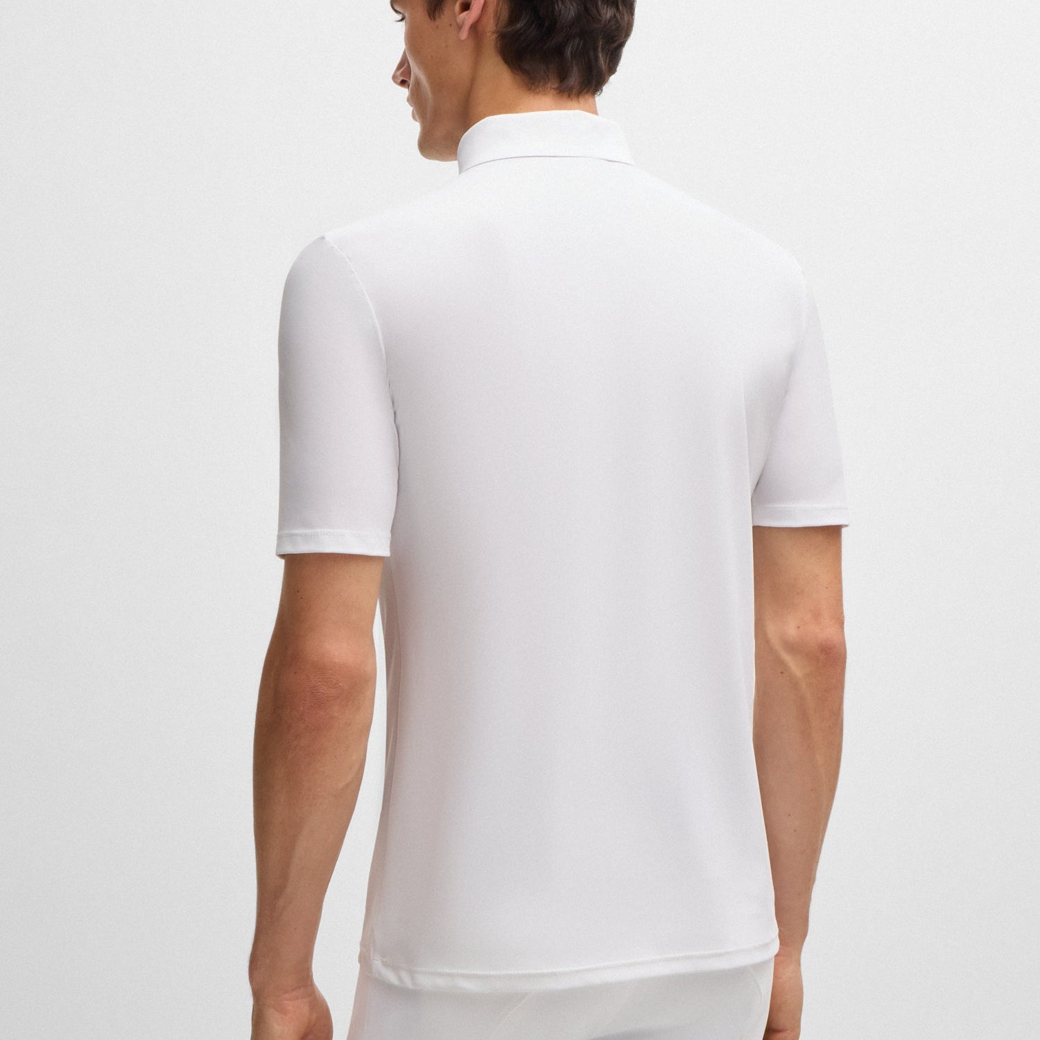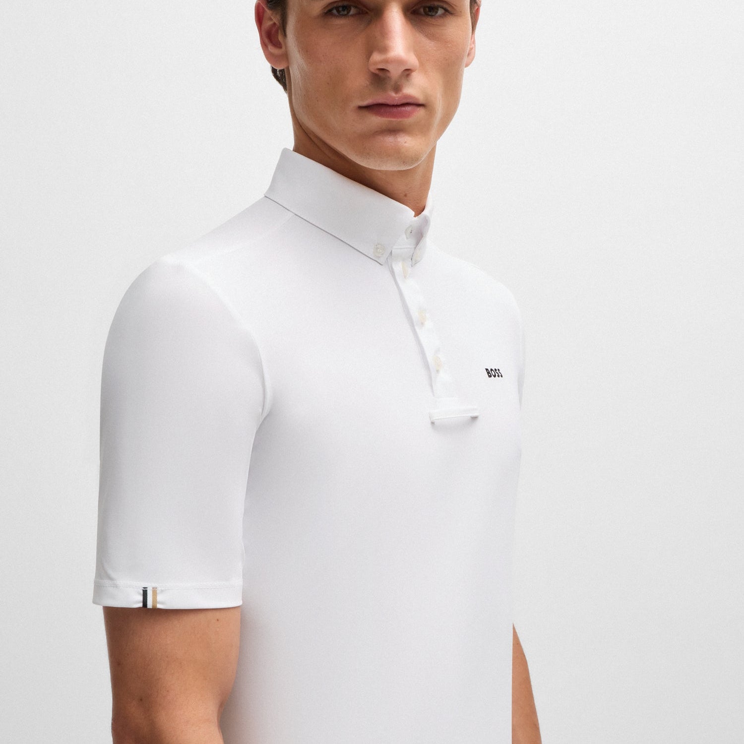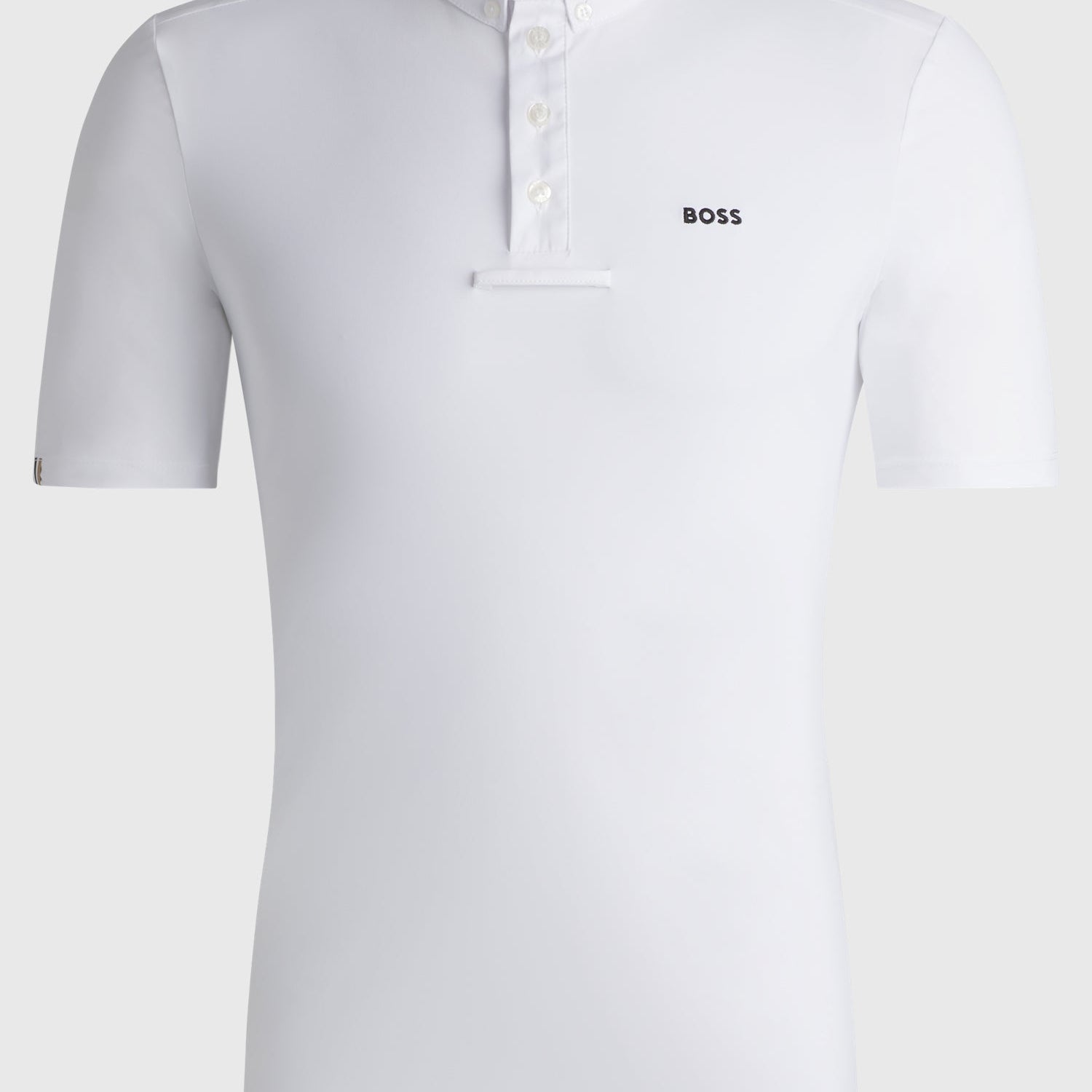 The men's full-grip dressage breeches offer a perfect fit in the saddle without restricting movement. Crafted from 4-way stretch technical jersey, they combine elegance with performance. The fabric provides excellent breathability, antibacterial properties, and UV protection, making them ideal for sports activities. The breeches feature two front pockets and two back pockets with buttons, complemented by a small embroidered logo on the thigh and elastic cuffs.