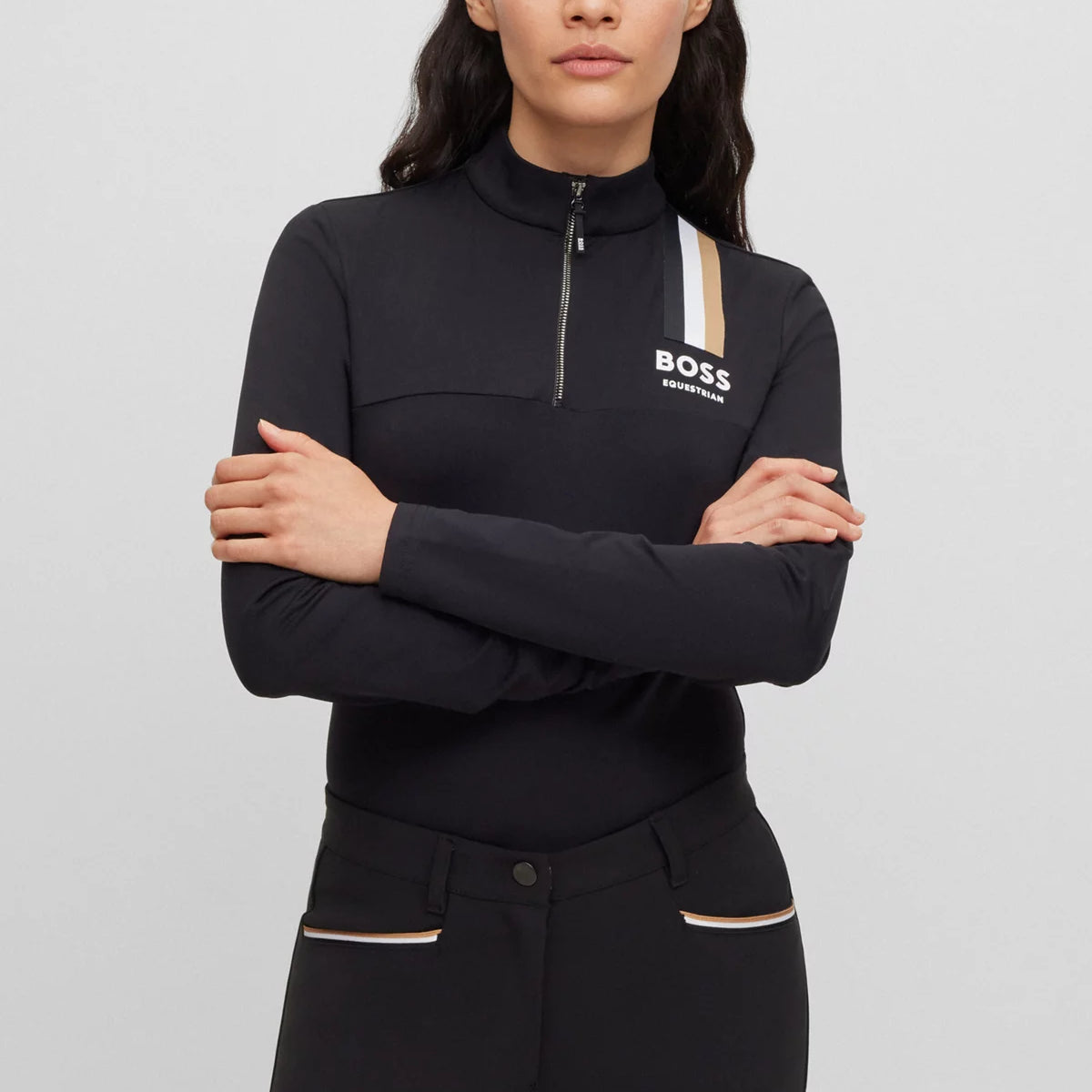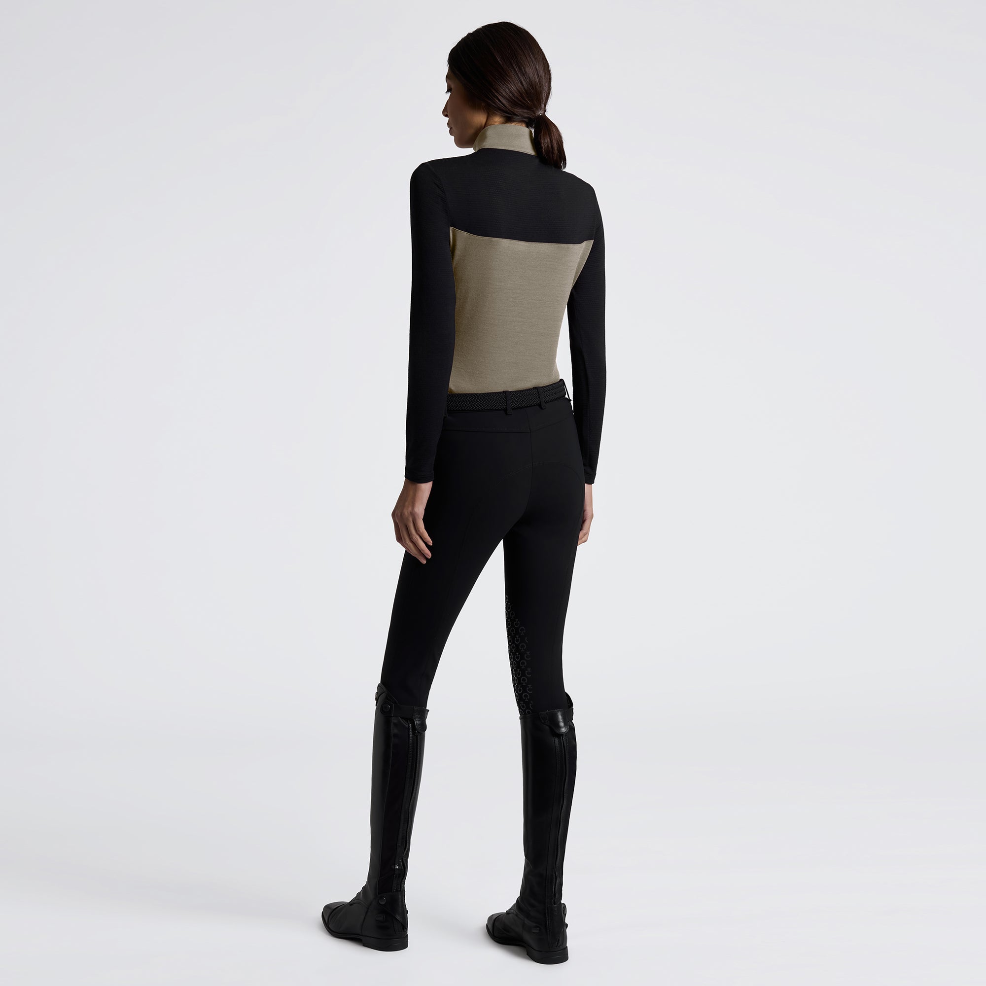 The Cavalleria Toscana Women’s Long Sleeve Training Polo with Half-Zip is crafted from technical wool and designed to support female riders during sports activities on cooler days. The design features water-repellent, windproof technical fabric on the sleeves and shoulders, while the wool body ensures thermal comfort and breathability. The high collar and personalized half-zip improve protection and fit. Finished with the Cavalleria Toscana heat-applied logo, this polo blends performance, contemporary design, and functional style.