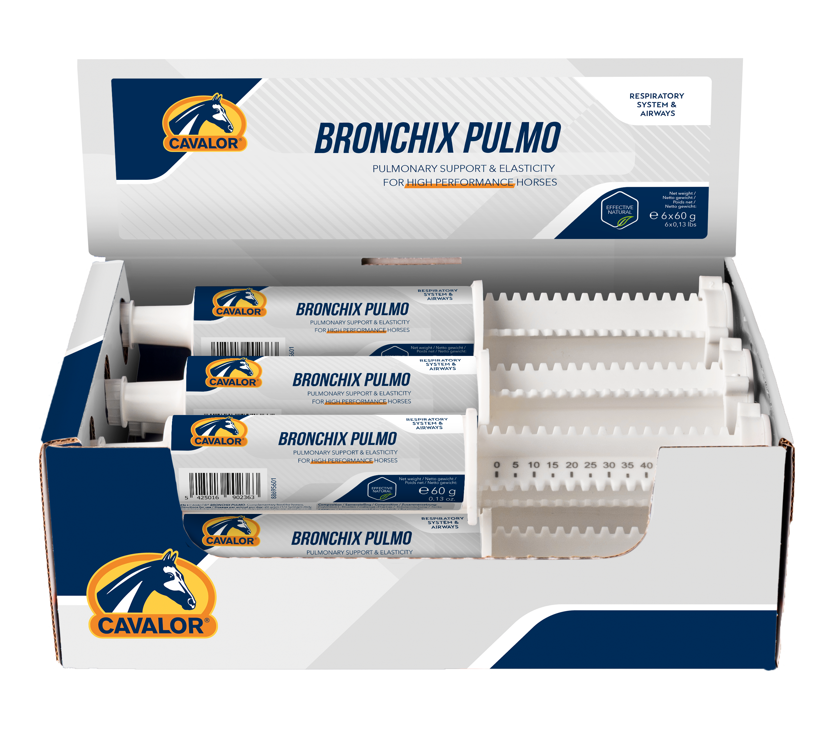 Cavalor Bronchix Liq is a blend of aromatic herbal extracts (including Pinus sylvestris, eucalyptus, oregano and rosemary) with expectorant and soothing properties.