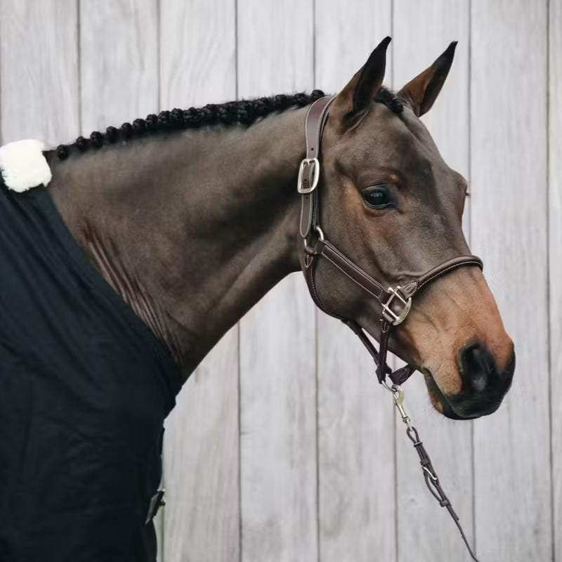 The Anatomic Leather Halter is anatomically made and has a wider neck piece behind the ears. Therefore, the pressure is divided over a larger area. The nose piece is made of rolled artificial leather.