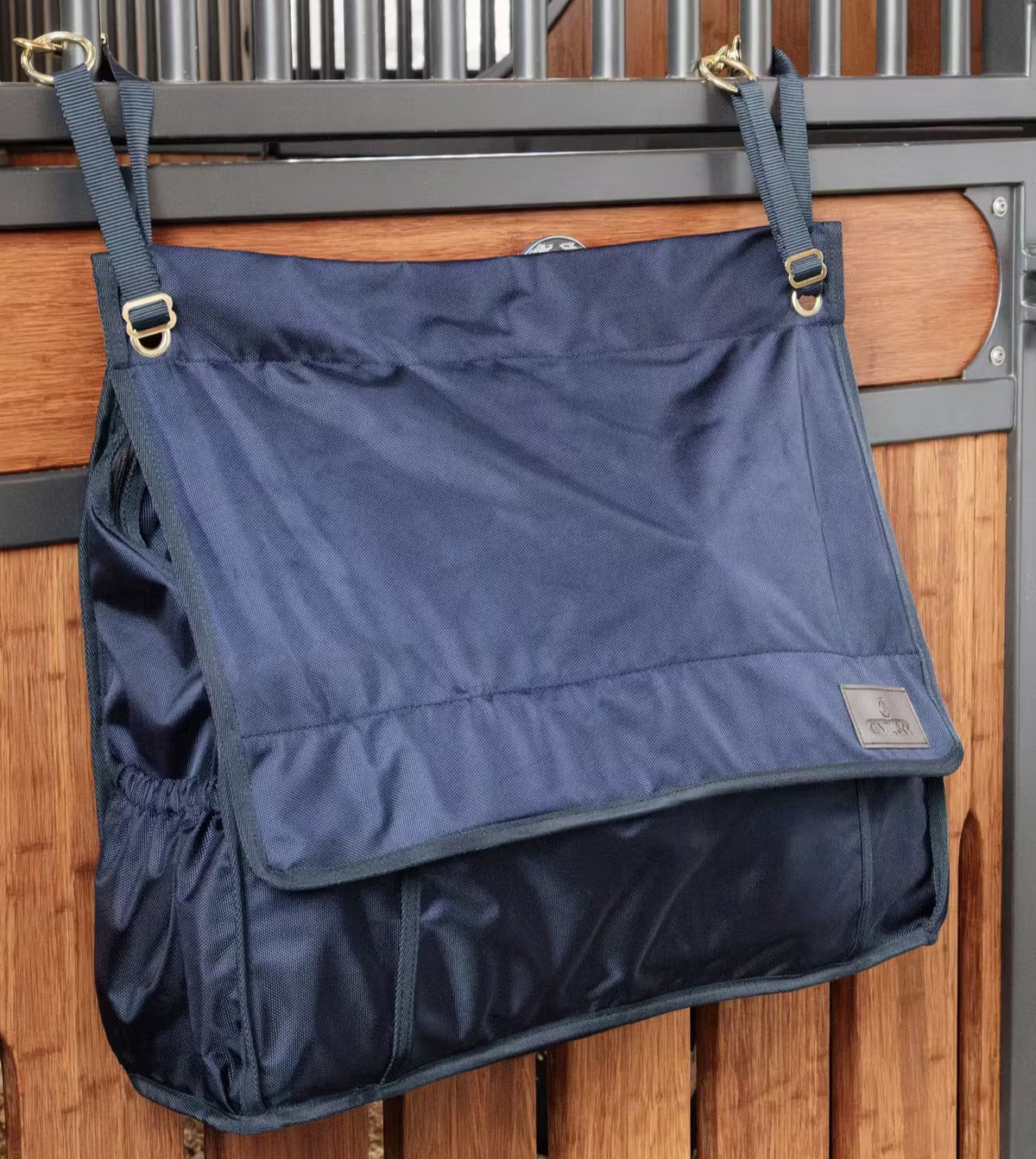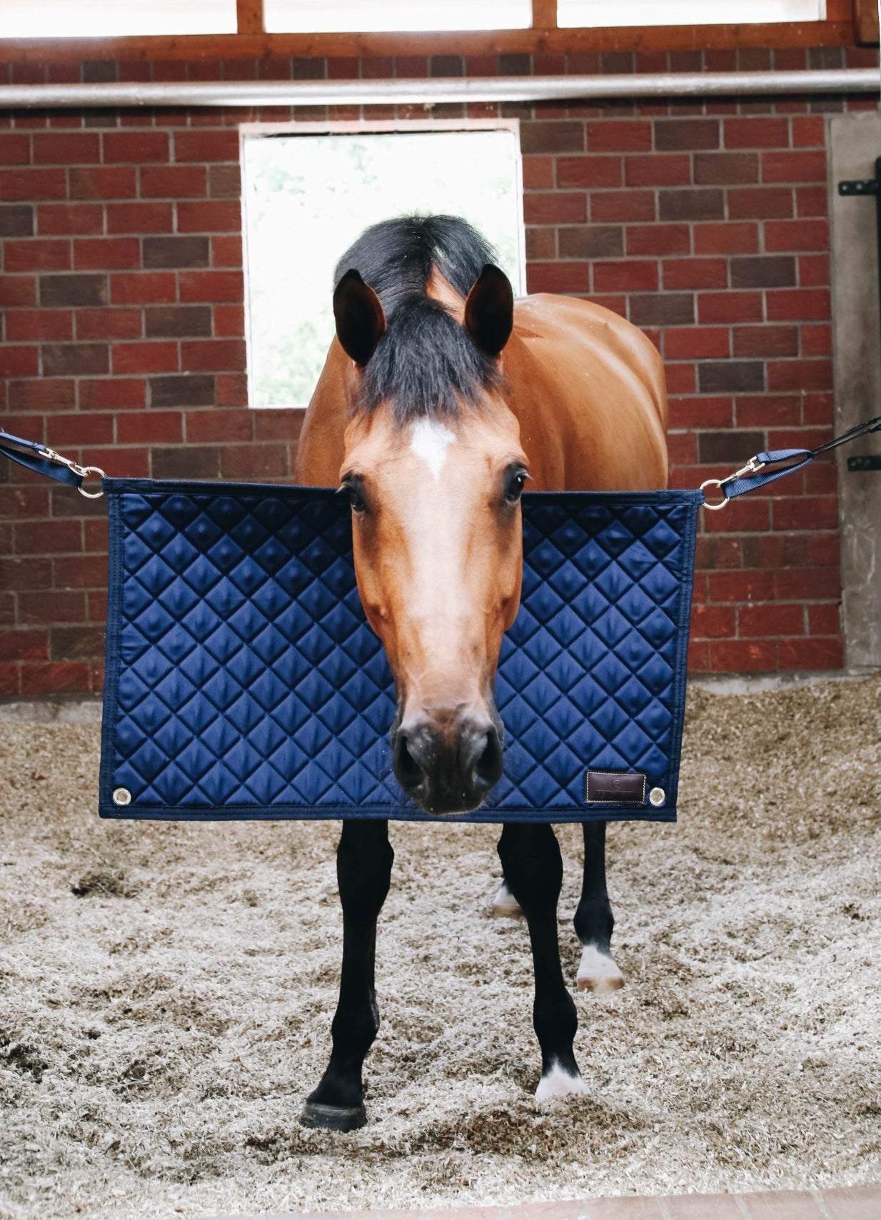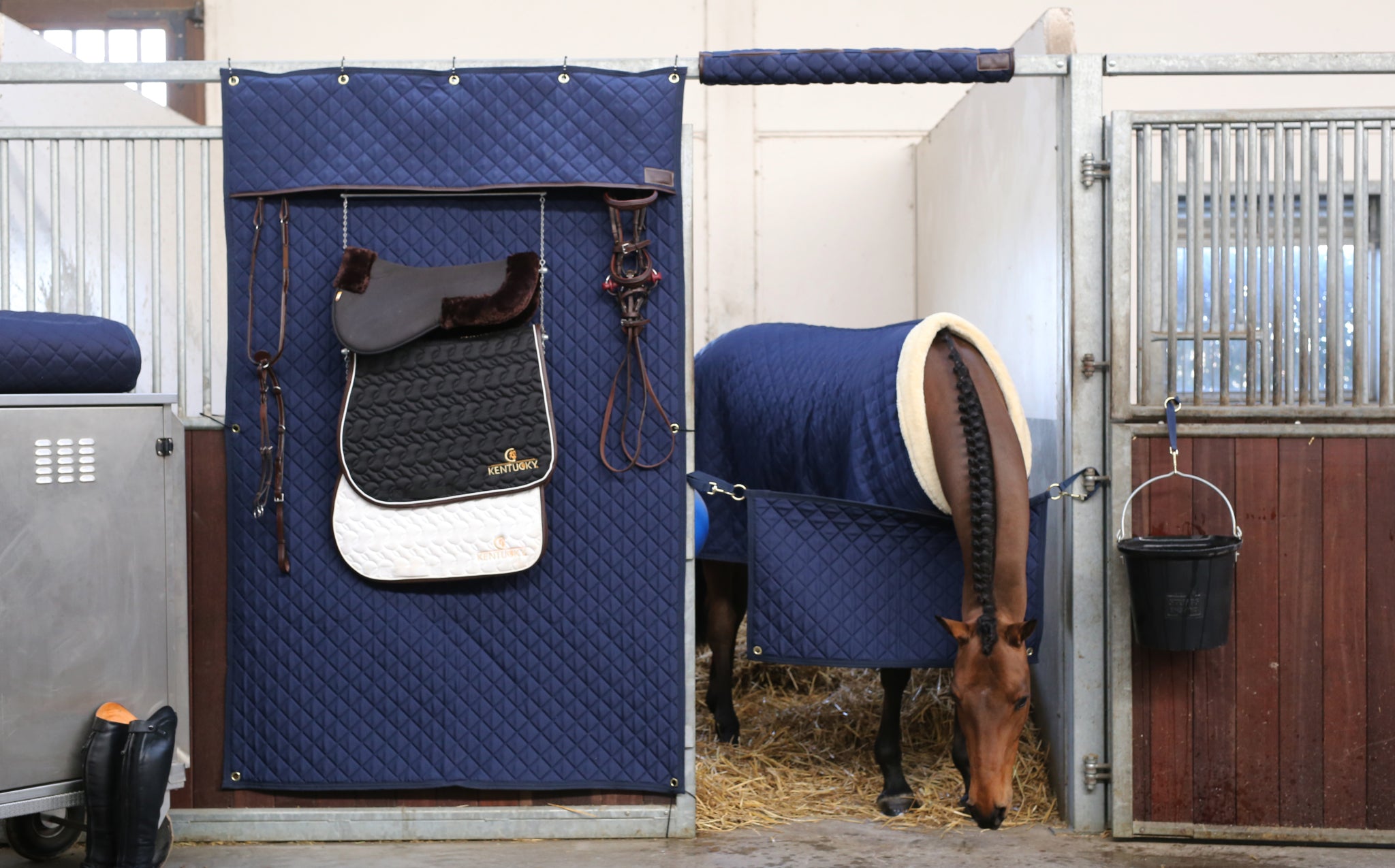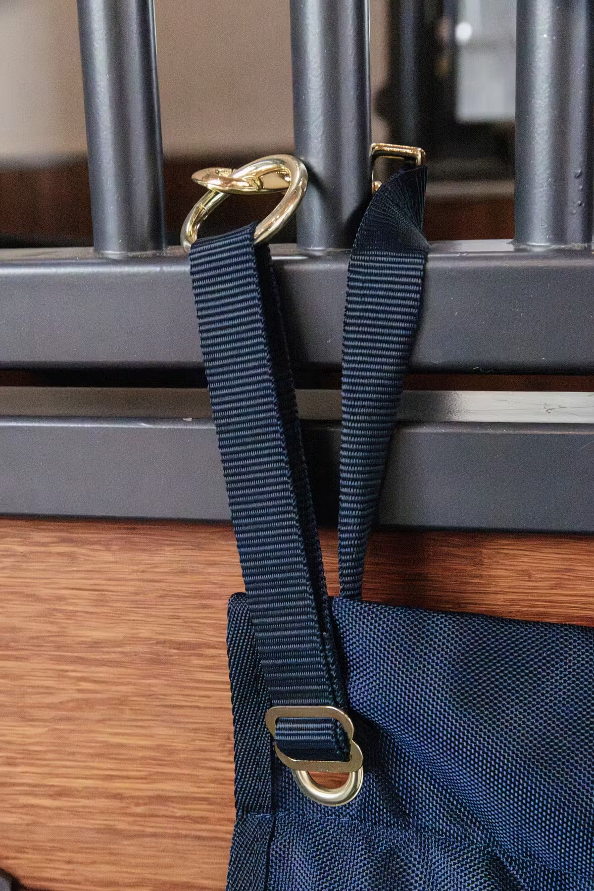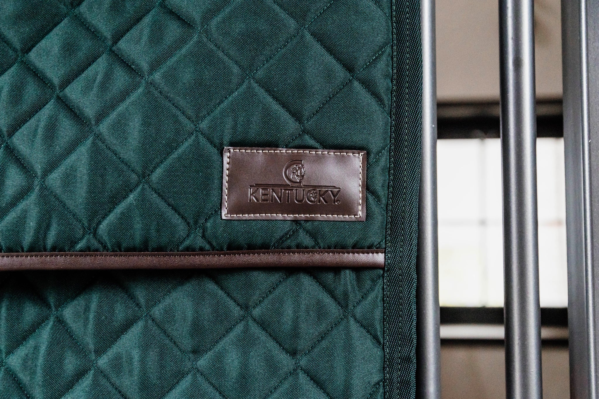 A reversible name tag on the front offers space for personalization. The bag also features a hook-and-ring system at the top, making it easy to hang anywhere. Styled with the same elegant diamond quilting as our stable collection (curtain, guard, head protector) and rugs, it completes the signature Kentucky show look.