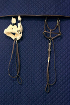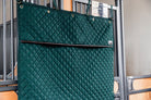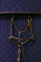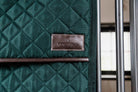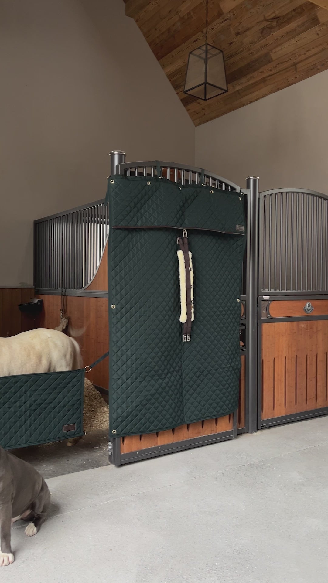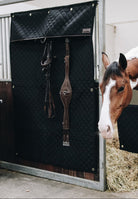 The curtain is equipped with five reinforced gold-colored rings for secure attachment to the stall. Hidden beneath a stylish flap adorned with a vegan leather Kentucky logo, yfind five snap hooks ideal for neatly hanging accessories like bridles, rug racks, or grooming tools. These hooks are discreetly tucked away behind the flap for a clean, uncluttered appearance. The elegant diamond quilting, vegan leather piping, and refined logo complete the luxurious look.